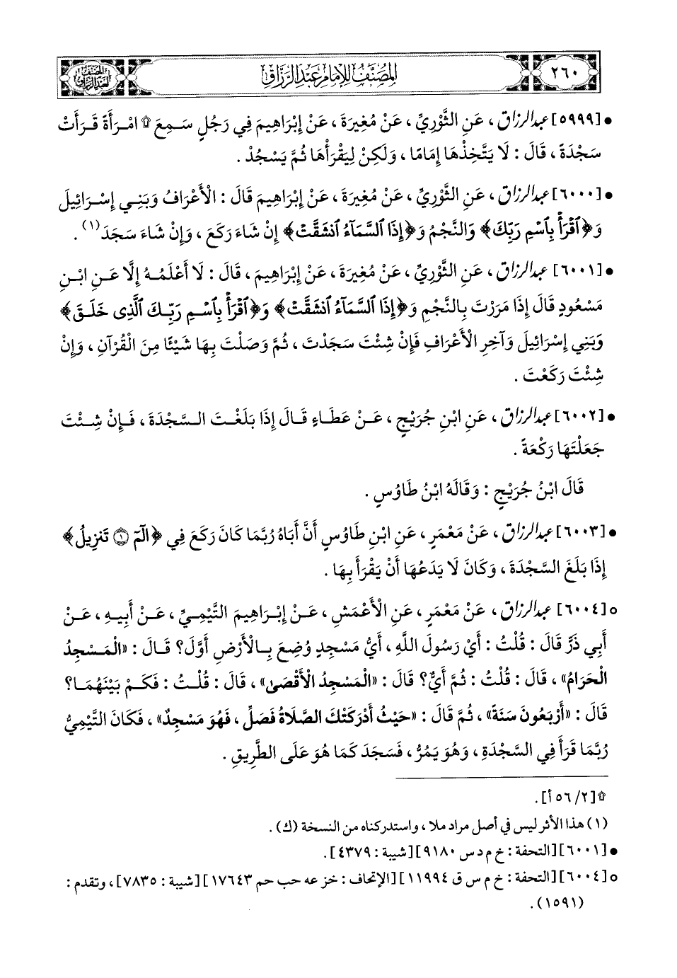 6000- عبد الرزاق، عَنِ الثَّورِيِّ، عَن مُغِيرَةَ، عَن إِبرَاهِيمَ، قَالَ: الأَعْرَافُ، وَبَنِي إِسْرَائِيلَ، وَ:{اقْرَأْ بِاسْمِ رَبِّكَ}، وَالنَّجْمُ، وَ{إِذَا السَّمَاءُ انْشَقَّتْ}، إِنْ شَاءَ رَكَعَ، وَإِنْ شَاءَ سَجَدَ.