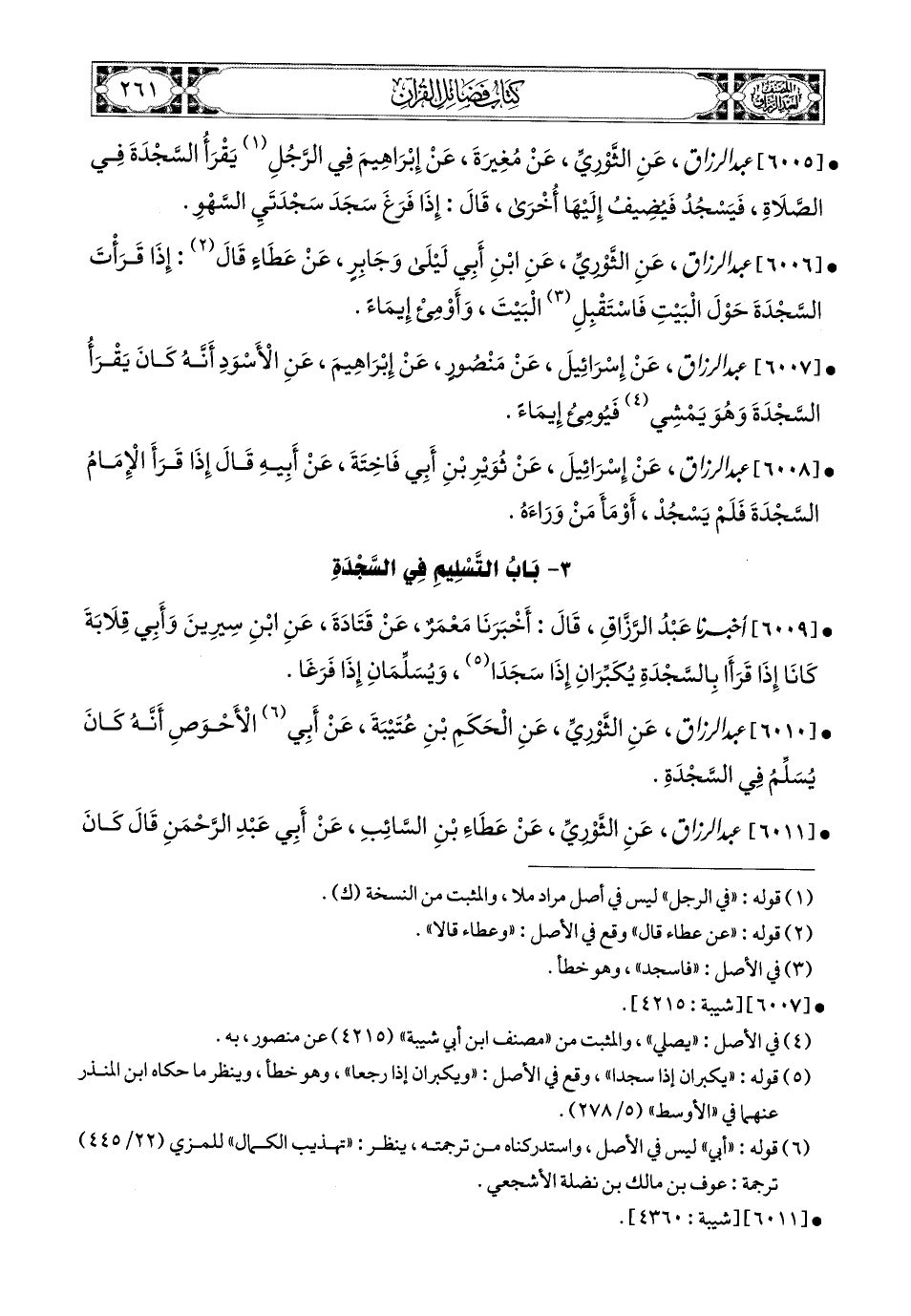 6010- عبد الرزاق، عَنِ الثَّورِيِّ، عَنِ الْحَكَمِ بْنِ عُتَيْبَةَ، عَنْ أَبِي الأَحْوَصِ، أَنَّهُ كَانَ يُسَلِّمُ فِي السَّجْدَةِ.