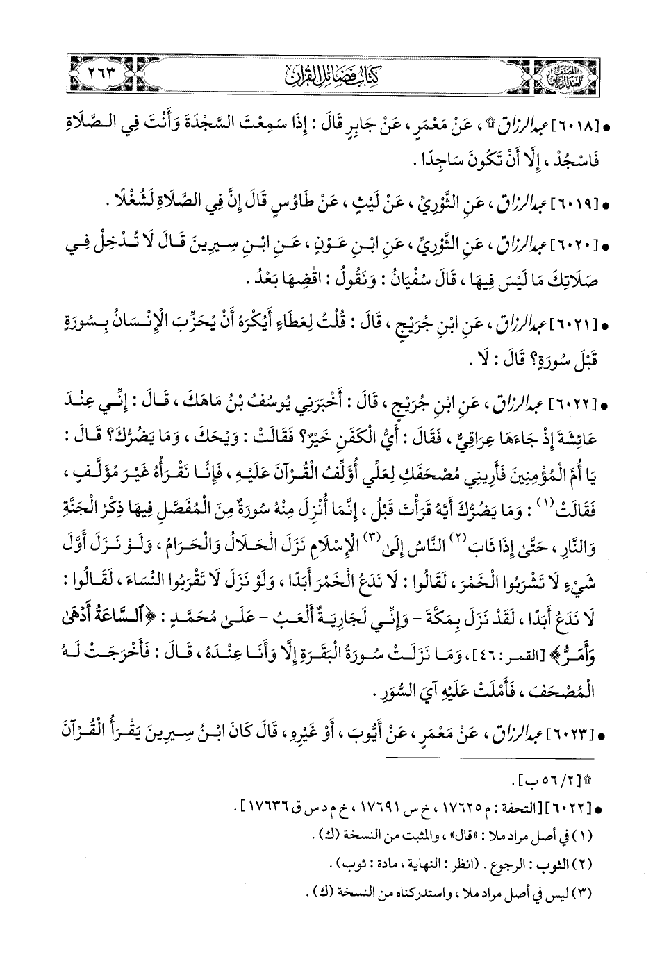 6021- عبد الرزاق، عَنِ ابْنِ جُرَيْجٍ، قَالَ: قُلْتُ لِعَطَاءٍ: أَيُكْرَهُ أَنْ يُحَزِّبَ الإِنْسَانُ بِسُورَةٍ قَبْلَ سُورَةٍ؟ قَالَ: لاَ.