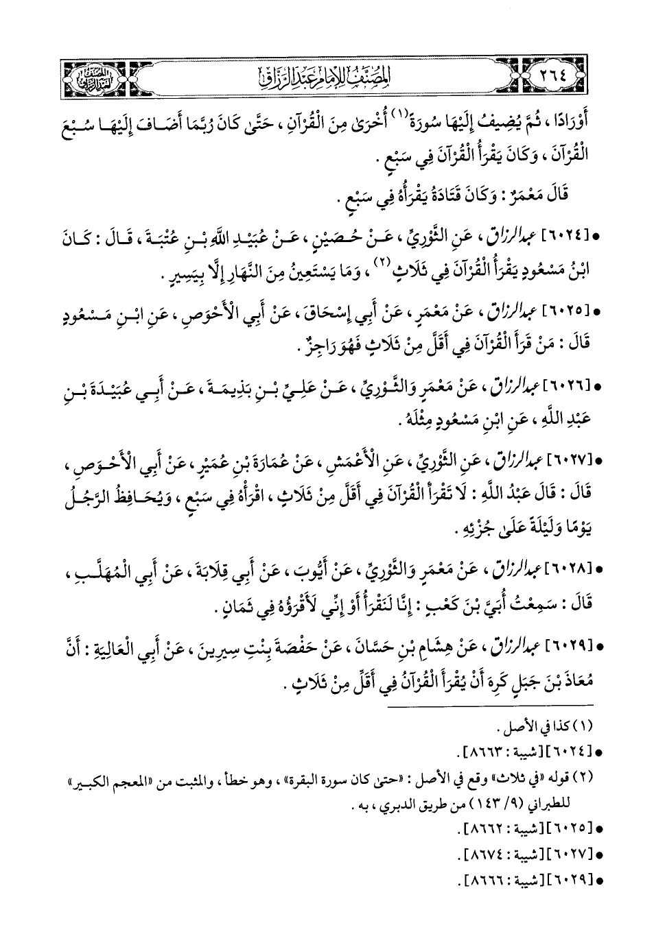 6024- عبد الرزاق، عَنِ الثَّورِيِّ، عَن حُصَيْنٍ، عَن عُبَيْدِ اللهِ بْنِ عُتْبَةَ قَالَ: كَانَ ابْنُ مَسْعُودٍ يَقْرَأُ الْقُرْآنَ فِي ثَلاَثٍ وَمَا يَسْتَعِينُ مِنَ النَّهَارِ إِلاَّ بِيَسِيرٍ.