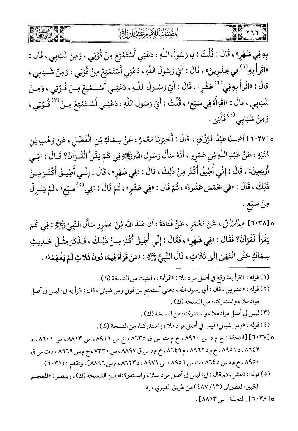 6038- عبد الرزاق، عَنْ مَعْمَرٍ، عَن قَتَادَةَ، أَنَّ عَبدَ اللهِ بن عَمْرٍو سَأَلَ النَّبِيَّ صَلَّى اللهُ عَلَيْهِ وَسَلَّمَ: فِي كَمْ يُقْرَأُ الْقُرْآنُ؟ فَقَالَ: فِي شَهْرٍ، فَقَالَ: إِنِّي أُطِيقُ أَكْثَرَ مِنْ ذَلِكَ، فَذَكَرَ مِثْلَ حَدِيثِ سِمَاكٍ، حَتَّى انْتَهَى إِلَى ثَلاَثٍ، قَالَ النَّبِيُّ صَلَّى اللهُ عَلَيْهِ وَسَلَّمَ: مَنْ قَرَأَهُ فِيمَا دُونَ ثَلاَثٍ لَمْ يَفْهَمْهُ.