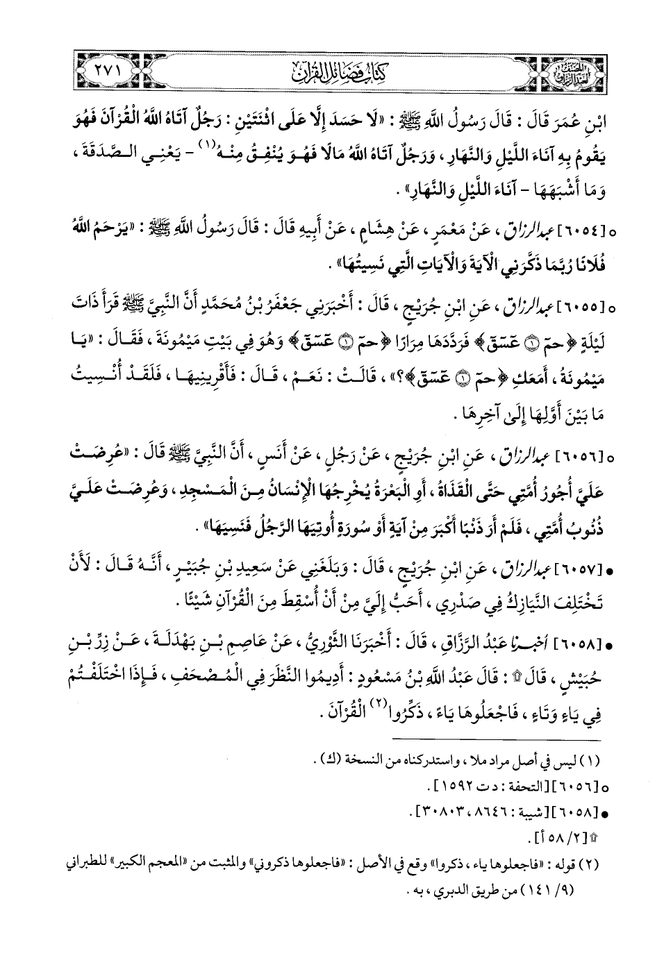 6054- عبد الرزاق، عَنْ مَعْمَرٍ، عَن هِشَامٍ، عَنْ أَبِيهِ، قَالَ: قَالَ رَسُولُ اللهِ صَلَّى اللهُ عَلَيْهِ وَسَلَّمَ: يَرْحَمُ اللهُ فُلاَنًا، رُبَّمَا ذَكَّرَنِي الآيَةَ وَالآيَاتِ الَّتِي نُسِّيتُهَا.