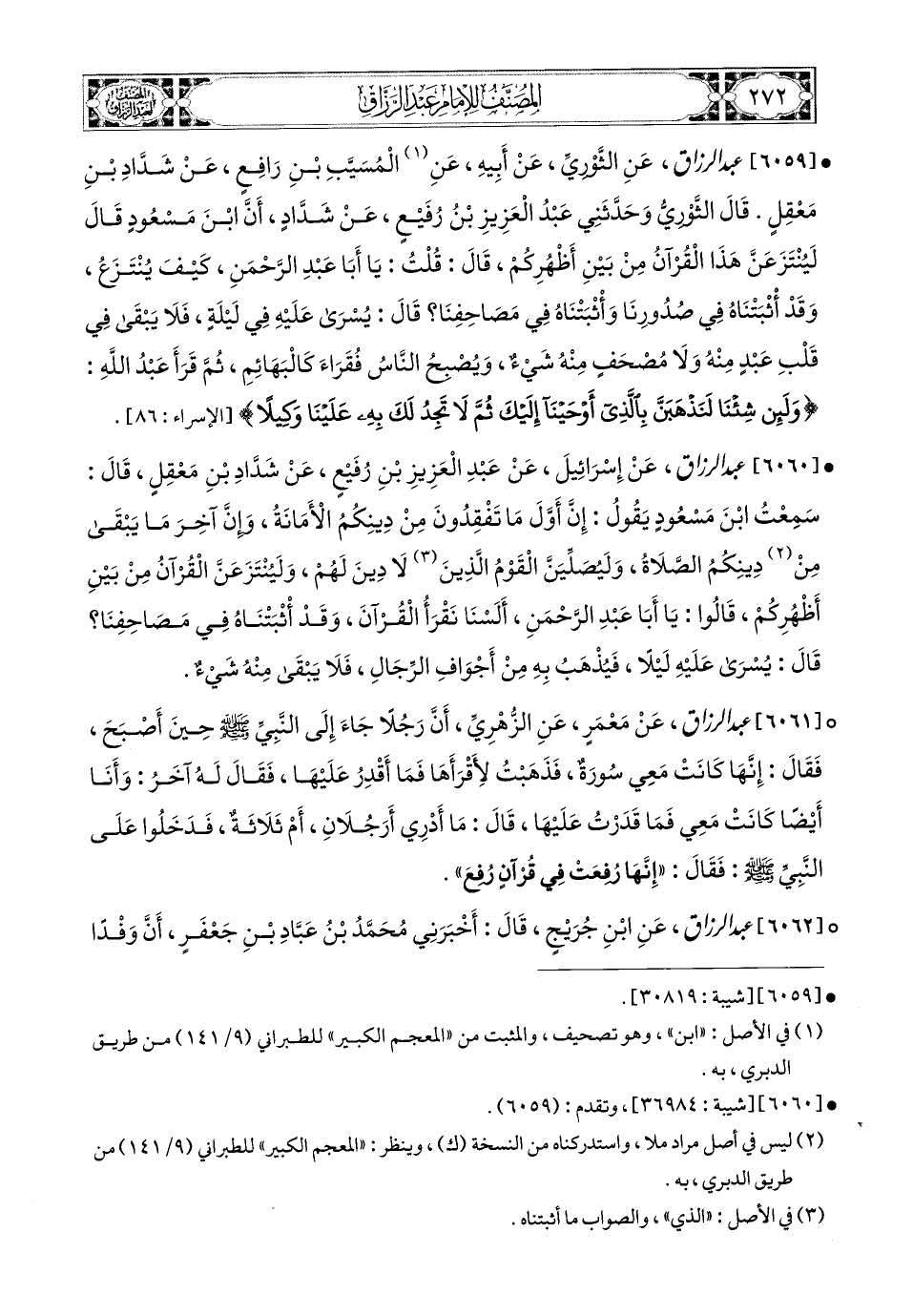 6060- عبد الرزاق، عَن إِسْرَائِيلَ، عَنْ عَبدِ الْعَزِيزِ بْنِ رُفَيْعٍ، عَن شَدَّادِ بْنِ مَعْقِلٍ، قَالَ: سَمِعْتُ ابْنَ مَسْعُودٍ يَقُولُ: إِنَّ أَوَّلَ مَا تَفْقِدُونَ مِنْ دِينِكُمُ الأَمَانَةُ، وَإِنَّ آخِرَ مَا يَبْقَى مِنْ دِينِكُمُ الصَّلاَةُ، وَلَيُصَلِّيَنَّ الْقَوْمُ الذي لاَ دِينَ لَهُمْ، وَلَيُنْتَزَعَنَّ الْقُرْآنُ مِنْ بَيْنَ أَظْهُرِكُمْ، قَالُوا: يَا أَبَا عَبدِ الرَّحْمَنِ، أَلَسْنَا نَقْرَأُ الْقُرْآنَ، وَقَدْ أَثْبَتْنَاهُ فِي مَصَاحِفِنَا؟ قَالَ: يُسْرَى عَلَيْهِ لَيْلاً، فَيُذْهَبُ بِهِ مِنْ أَجْوَافِ الرِّجَالِ، فَلاَ يَبْقَى مِنْهُ شَيءٌ.