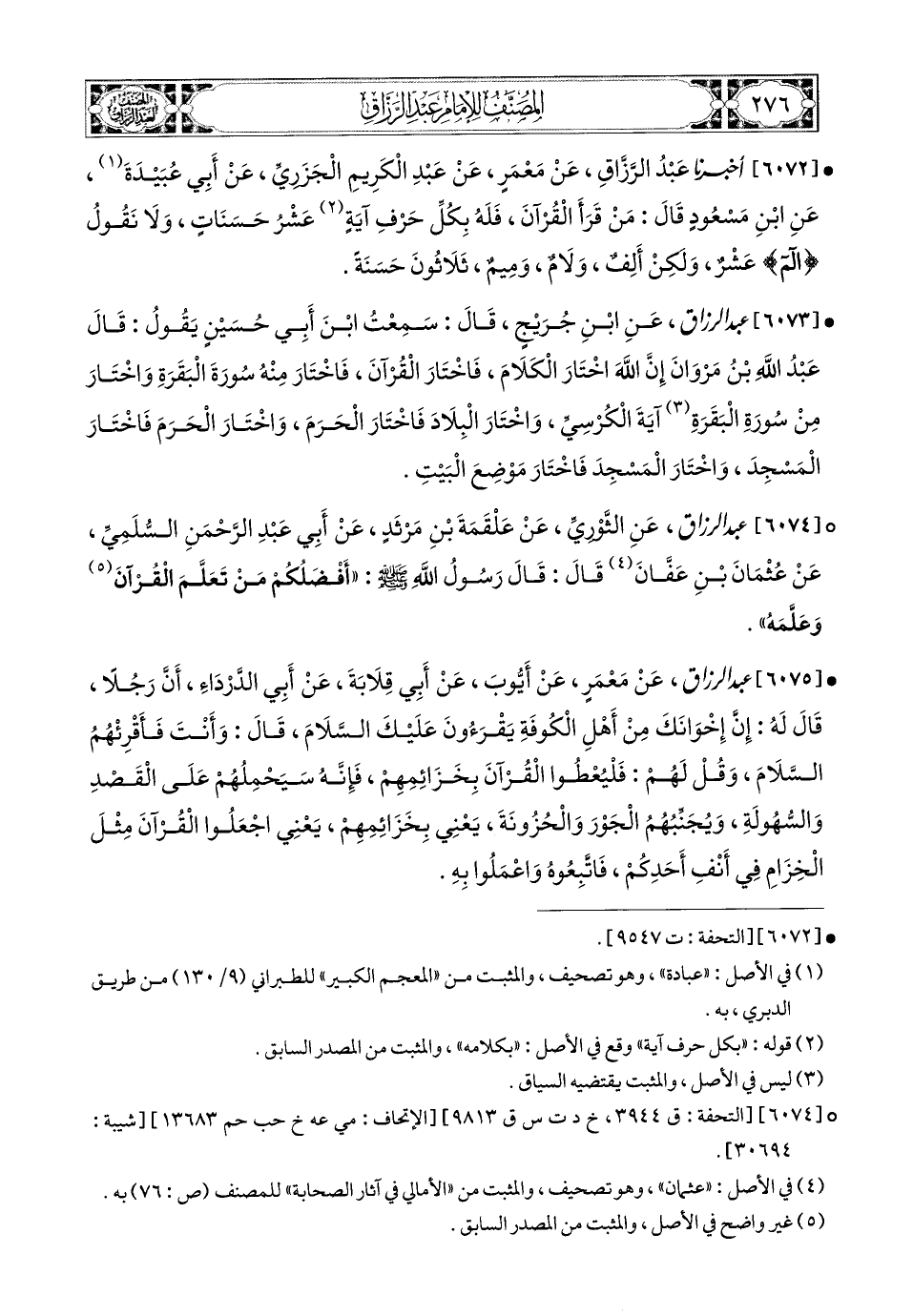 6074- عبد الرزاق، عَنِ الثَّورِيِّ، عَنْ عَلْقَمَةَ بْنِ مَرْثَدٍ، عَنْ أَبِي عَبدِ الرَّحْمَنِ السُّلَمِيِّ، عَن عُثْمَانَ بْنِ عَفَّانَ قَالَ: قَالَ رَسُولُ اللهِ صَلَّى اللهُ عَلَيْهِ وَسَلَّمَ: أَفْضَلُكُمْ مَنْ تَعَلَّمَ الْقُرْآنَ وَعَلَّمَهُ.
