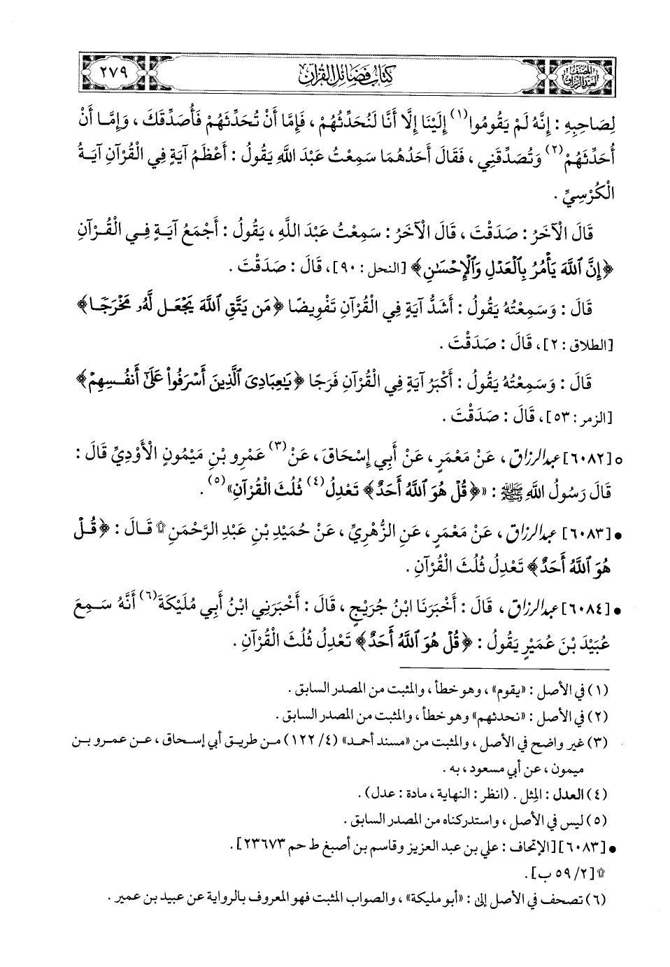 6083- عبد الرزاق، عَنْ مَعْمَرٍ، عَنِ الزُّهْرِيِّ، عَن حُمَيْدِ بْنِ عَبدِ الرَّحْمَنِ قَالَ: {قُلْ هُوَ اللهُ أَحَدٌ} تَعْدِلُ ثُلُثَ الْقُرْآنِ.