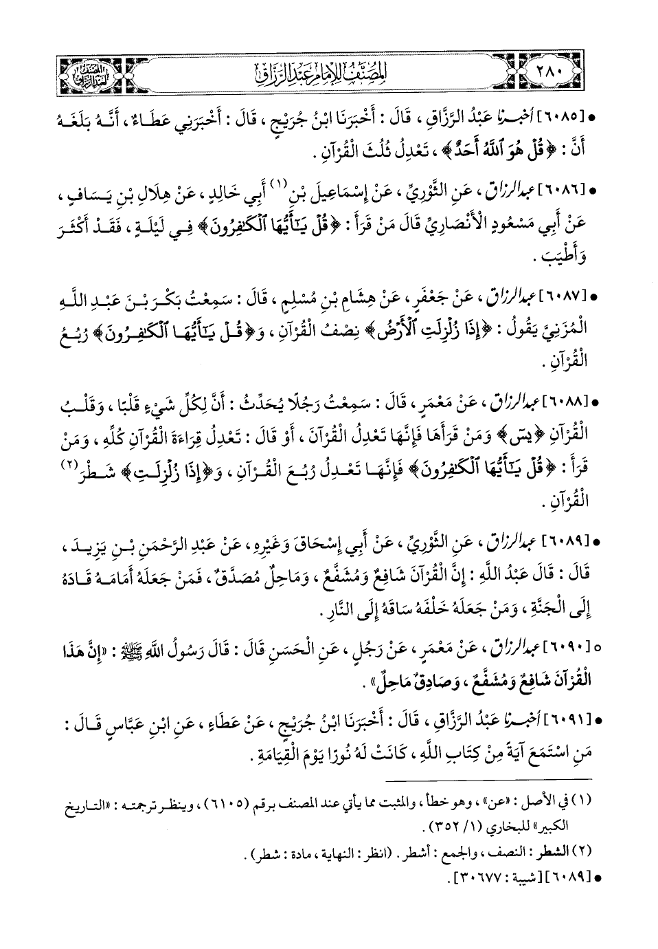 6085- أخبرنا عبد الرزاق، قَالَ: أَخْبَرَنَا ابْنُ جُرَيْجٍ، قَالَ: أَخْبَرَنِي عَطَاءٌ، أَنَّهُ بَلَغَهُ أَنَّ {قُلْ هُوَ اللهُ أَحَدٌ} تَعْدِلُ ثُلُثَ الْقُرْآنِ.