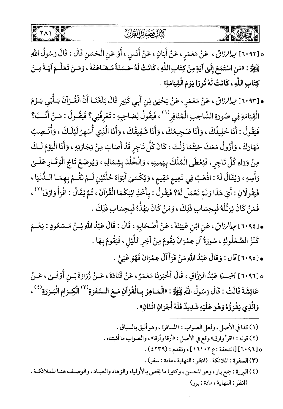 6096- أخبرنا عبد الرزاق، قَالَ: أَخْبَرَنَا مَعْمَرٌ، عَن قَتَادَةَ، عَن زُرَارَةَ بْنِ أَوْفَى، عَنْ عَائِشَةَ، قَالَتْ: قَالَ رَسُولُ اللهِ صَلَّى اللهُ عَلَيْهِ وَسَلَّمَ: المَاهِرُ بِالْقُرْآنِ مَعَ السَّفَرَةِ الْكِرَامِ الْبَرَرَةِ، وَالَّذِي يَقْرَأُهُ وَهُوَ عَلَيْهِ شَدِيدٌ فَلَهُ أَجْرَانِ اثْنَانِ.