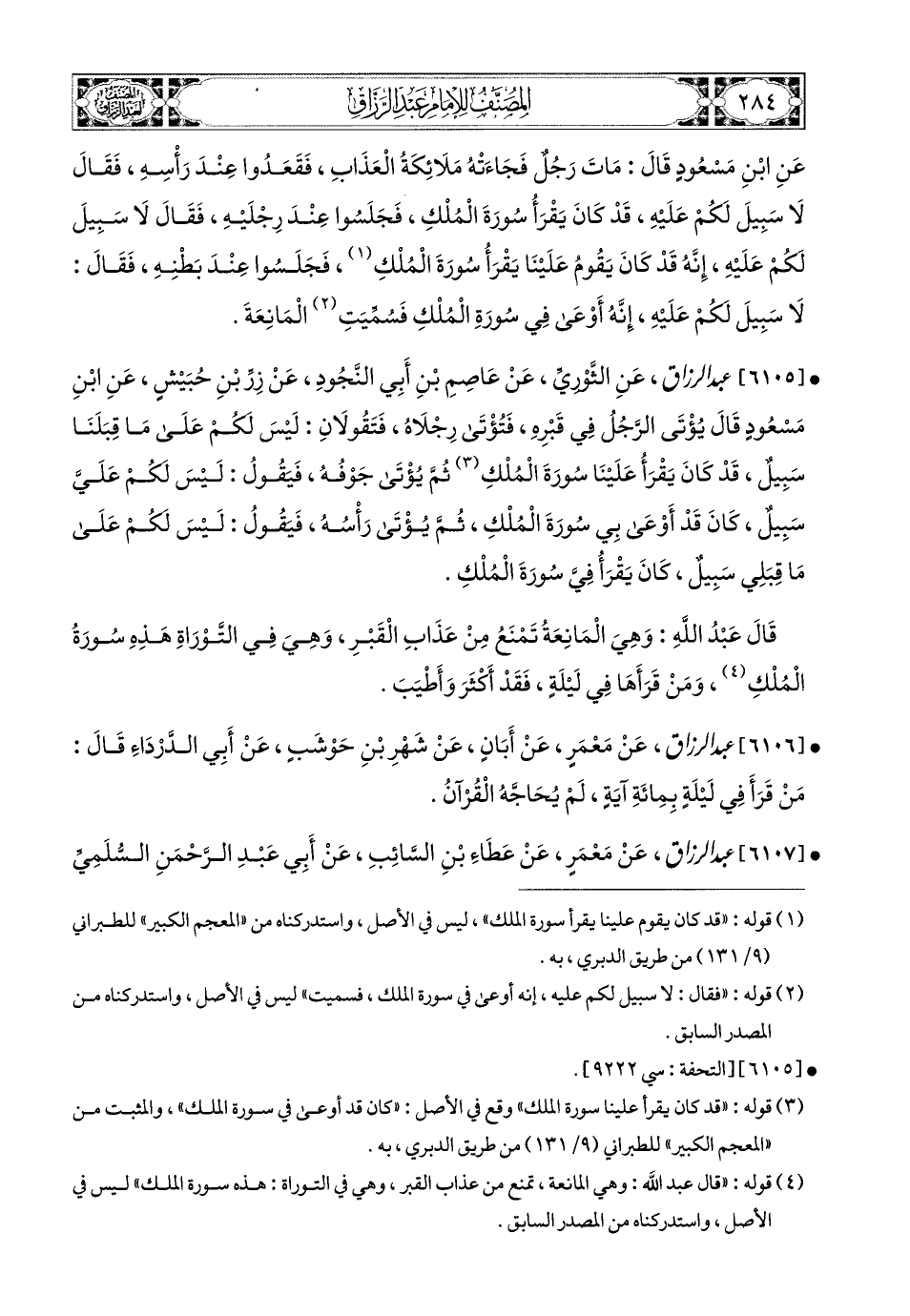 6105- عبد الرزاق، عَنِ الثَّورِيِّ، عَنْ عَاصِمِ بْنِ أَبِي النَّجُودِ، عَن زِرِّ بْنِ حُبَيْشٍ، عَنِ ابْنِ مَسْعُودٍ قَالَ: يُؤْتَى الرَّجُلُ فِي قَبْرِهِ، فَتُؤْتَى رِجْلاَهُ، فَتَقُوَلاَنِ: لَيْسَ لَكُمْ عَلَى مَا قِبَلَنَا سَبِيلٌ، قَدْ كَانَ يَقْرَأُ عَلَيْنَا سُورَةَ المُلْكِ، ثُمَّ يُؤْتَى جَوْفُهُ، فَيَقُولُ: لَيْسَ لَكُمْ عَلَيَّ سَبِيلٌ، كَانَ قَدْ أَوْعَى بِي سُورَةَ المُلْكِ، ثُمَّ يُؤْتَى رَأْسُهُ، فَيَقُولُ: لَيْسَ لَكُمْ عَلَى مَا قِبَلِي سَبِيلٌ، كَانَ يَقْرَأُ فِيَّ سُورَةَ المُلْكِ.