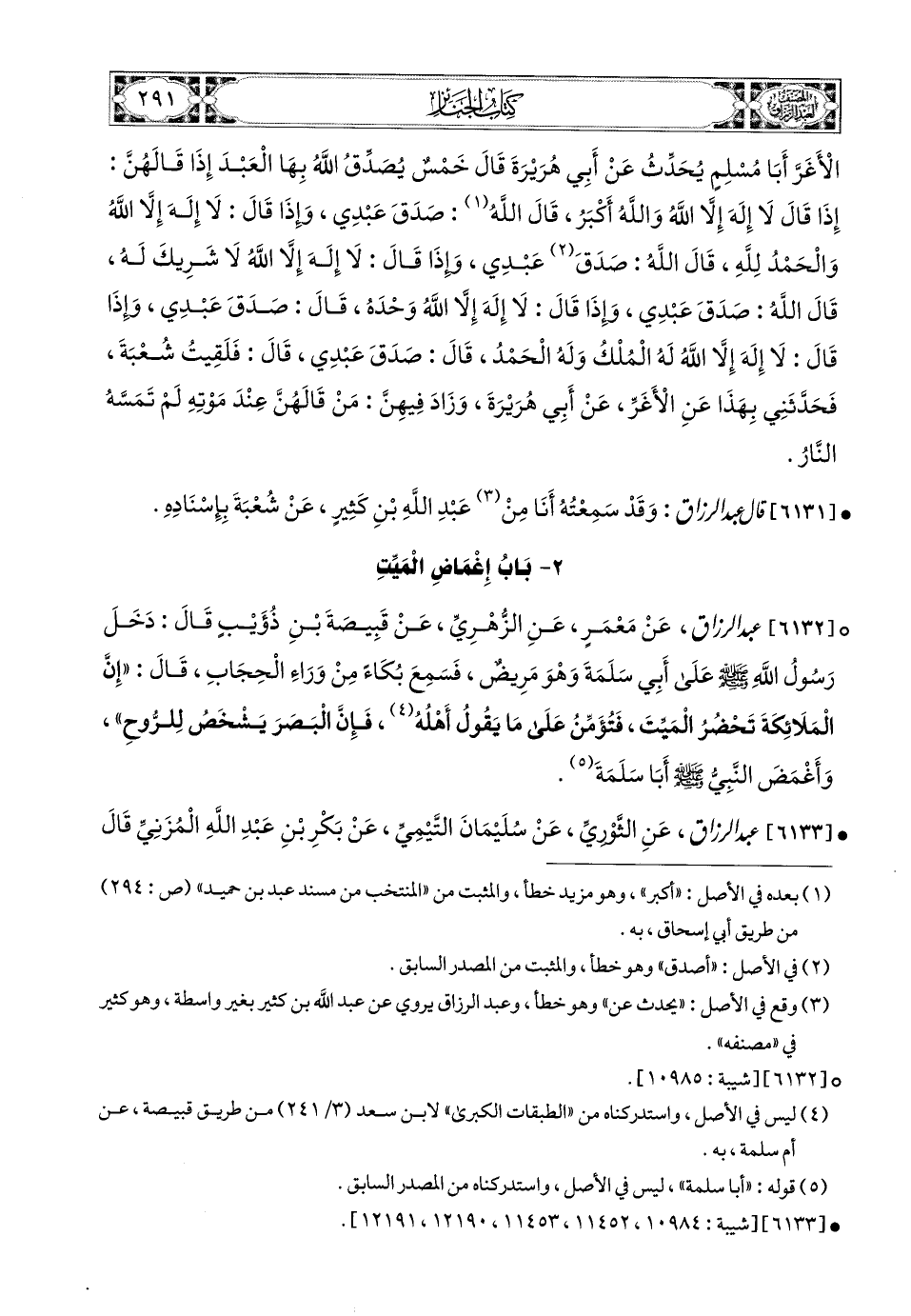 6132- عبد الرزاق، عَنْ مَعْمَرٍ، عَنِ الزُّهْرِيِّ، عَن قَبِيصَةَ بْنِ ذُؤَيْبٍ، قَالَ: دَخَلَ رَسُولُ اللهِ صَلَّى اللهُ عَلَيْهِ وَسَلَّمَ عَلَى أَبِي سَلَمَةَ وَهُوَ مَرِيضٌ، فَسَمِعَ بُكَاءً مِنْ وَرَاءِ الحِجَابٍ، قَالَ: إِنَّ المَلاَئِكَةَ تَحْضُرُ المَيِّتَ، فَتُؤَمِّنَ عَلَى مَا يقَولُ أَهْلُهُ، فَإِنَّ الْبَصَرَ يَشْخَصُ لِلرُّوحِ، وَأَغْمَضَ النَّبِيُّ صَلَّى اللهُ عَلَيْهِ وَسَلَّمَ أَبَا سَلَمَةَ.