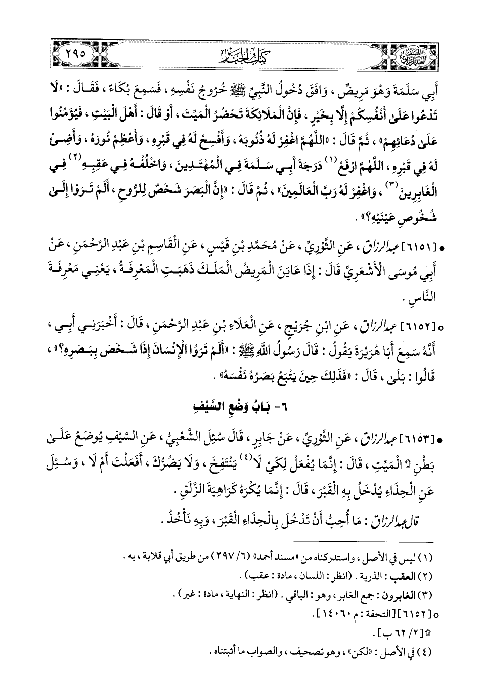 6153- عبد الرزاق، عَنِ الثَّورِيِّ، عَن جَابِرٍ قَالَ: سُئِلَ الشَّعْبِيُّ عَنِ السَّيْفِ يُوضَعُ عَلَى بَطْنِ المَيِّتِ، قَالَ: إِنَّمَا يُفْعَلُ لِكي لا يَنْتَفِخَ، وَلاَ يَضُرُّكَ أَفَعَلْتَ أَمْ لاَ، وَسُئِلَ عَنِ الْحِذَاءِ يُدْخَلُ بِهِ الْقَبْرَ، قَالَ: إِنَّمَا يُكْرَهُ كَرَاهِيَةَ الزَّلَقِ.