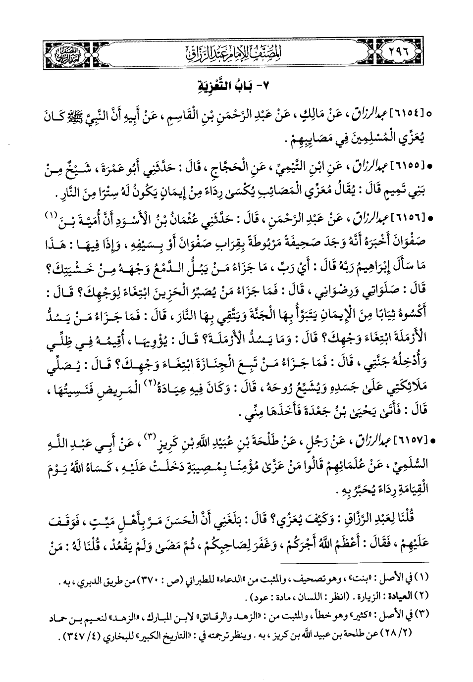 6154- عبد الرزاق، عَنْ مَالِكٍ، عَنْ عَبدِ الرَّحْمَنِ بْنِ الْقَاسِمِ، عَنْ أَبِيهِ، أَنَّ النَّبِيَّ صَلَّى اللهُ عَلَيْهِ وَسَلَّمَ كَانَ يُعَزِّي المُسْلِمِينَ فِي مَصَايِبِهِمْ.