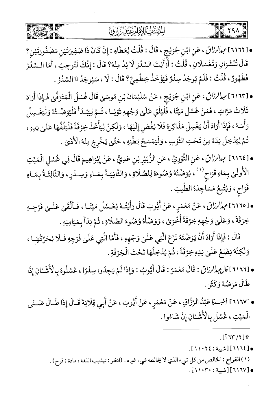(1) في طبعة دار الكتب العلمية زاد هنا: قَالَ عَبدُ الرَّزَّاقِ: قَالَ مَعْمَرٌ: وَكَانَ قَتَادَةُ يَقُولُ: يَبْدَأُ بِمَيَامِنِهِ قَالَ.