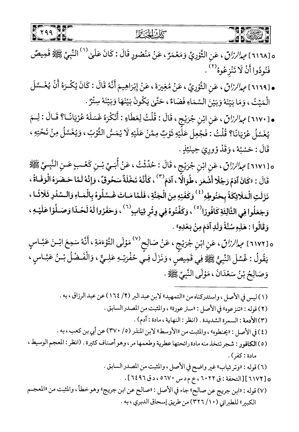 6171- عبد الرزاق، عَنِ ابْنِ جُرَيْجٍ، قَالَ: حُدِّثْتُ عَن أُبَيِّ بْنِ كَعْبٍ، عَنِ النَّبِيِّ صَلَّى اللهُ عَلَيْهِ وَسَلَّمَ قَالَ: كَانَ آدَمُ رَجُلاً أَشْعَرَ طُوَالاً آدَمَ، كَأَنَّهُ نَخْلَةٌ سَحُوقٌ، وَإِنَّهُ لَمَّا حَضَرَهُ الْوَفَاةُ، نَزَلَتِ المَلاَئِكَةُ بِحَنُوطِهِ وَكَفَنِهِ مِنَ الْجَنَّةِ، فَلَمَّا مَاتَ غَسَّلُوهُ بِالمَاءِ وَالسِّدْرِ ثَلاَثًا، وَجَعَلُوا فِي الثَّالِثَةِ كَافُورًا، وَكَفَّنُوهُ فِي وِتْرِ ثِيَابٍ، وَحَفَرُوا لَهُ لَحْدًا وَصَلَّوْا عَلَيْهِ، وَقَالُوا: هَذِهِ سُنَّةُ وَلَدِ آدَمَ مِنْ بَعْدِهِ.