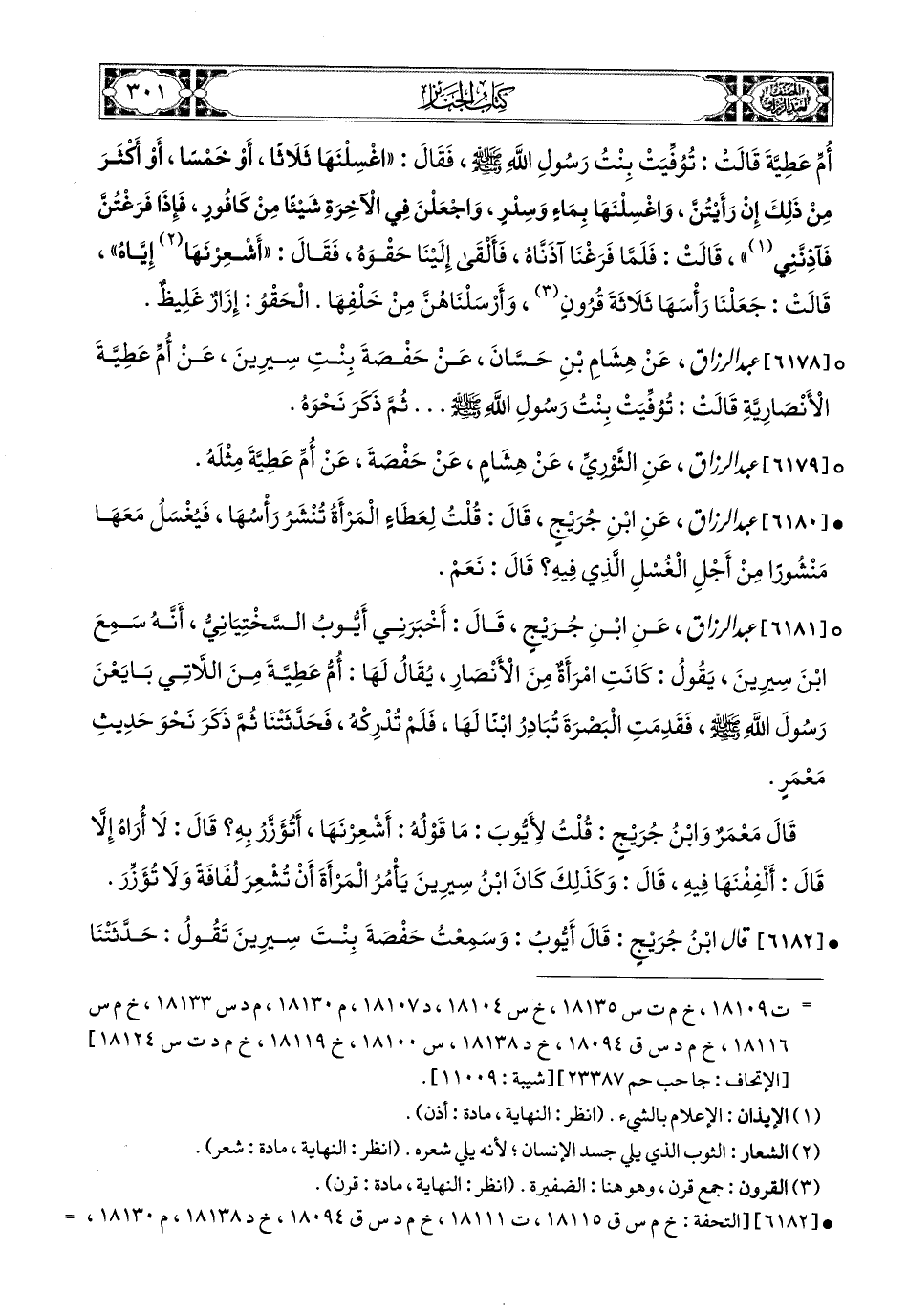 6178- عبد الرزاق، عَن هِشَامِ بْنِ حَسَّانَ، عَن حَفْصَةَ بِنْتِ سِيرِينَ، عَن أُمِّ عَطِيَّةَ الأَنْصَارِيَّةَ قَالَتْ: تُوُفِّيَتْ بِنْتُ رَسُولِ اللهِ صَلَّى اللهُ عَلَيْهِ وَسَلَّمَ، ثُمَّ ذَكَرَ نَحْوَهُ.