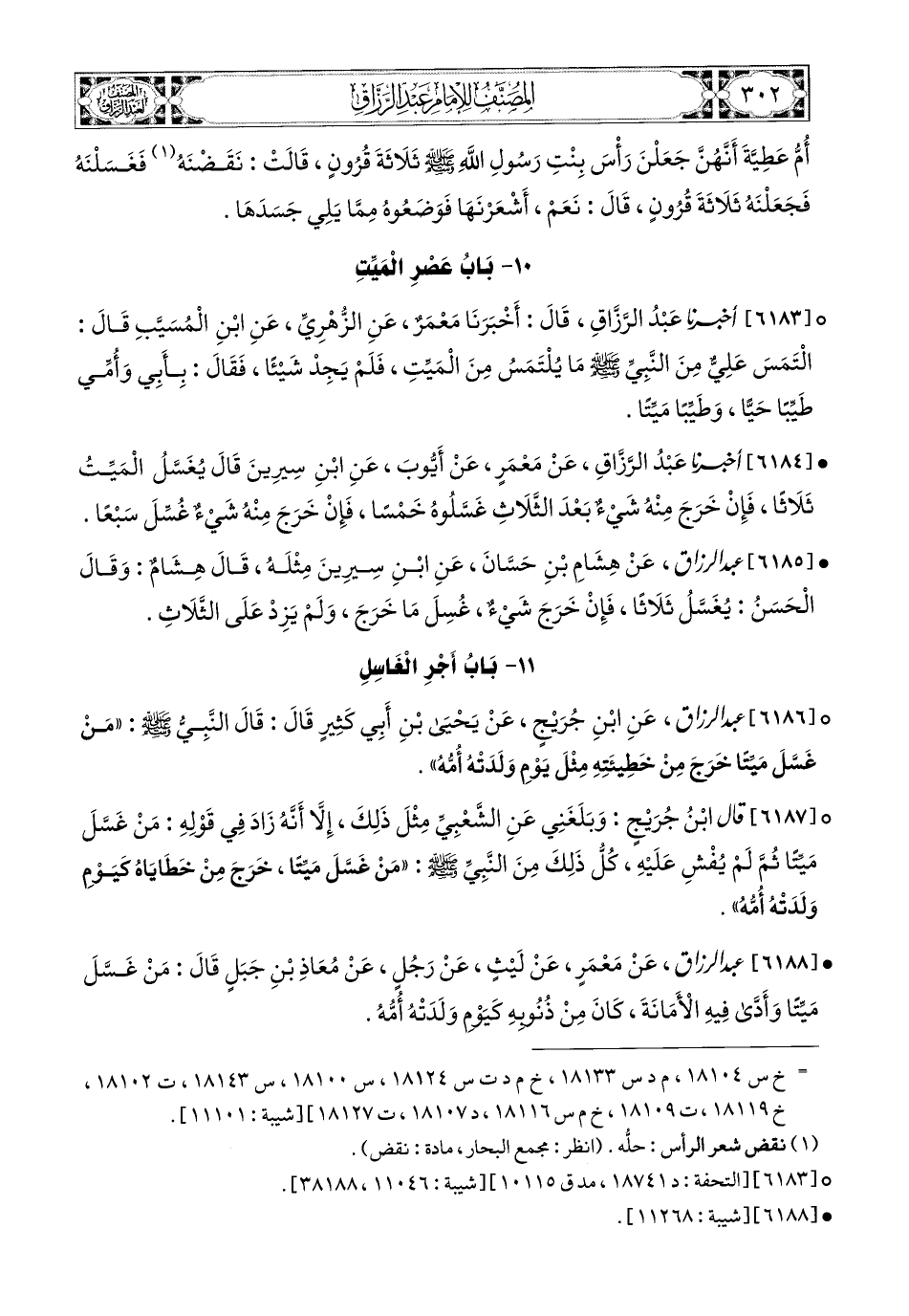6184- أخبرنا عبد الرزاق، عَنْ مَعْمَرٍ، عَنْ أَيُّوبَ، عَنِ ابْنِ سِيرِينَ، قَالَ: يُغَسَّلُ المَيِّتُ ثَلاَثًا، فَإِنْ خَرَجَ مِنْهُ شَيْءٌ بَعْدَ الثَّلاَثِ، غَسَّلُوهُ خَمْسًا، فَإِنْ خَرَجَ مِنْهُ شَيْءٌ، غُسِّلَ سَبْعًا.