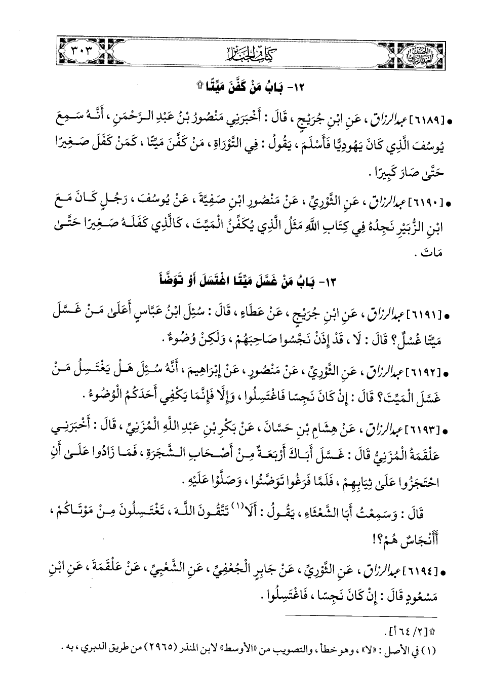 6192- عبد الرزاق، عَنِ الثَّورِيِّ، عَنْ مَنصُورٍ، عَن إِبرَاهِيمَ، أَنَّهُ سُئِلَ هَلْ يَغْتَسِلُ مَنْ غَسَّلَ المَيِّتَ؟ قَالَ: إِنْ كَانَ نَجِسًا فَاغْتَسِلُوا، وَإِلاَّ، فَإِنَّمَا يَكْفِي أَحَدَكُمُ الْوُضُوءُ.
