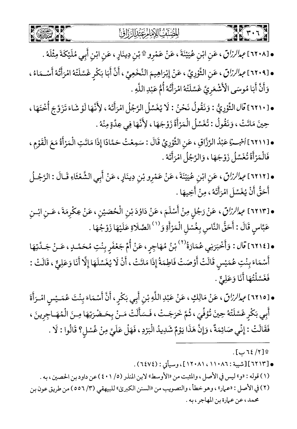 6213- عبد الرزاق، عَن رَجُلٍ مِنْ أَسْلَمَ، عَن دَاوُدِ بْنِ الْحُصَيْنِ، عَنْ عِكْرِمَةَ، عَنِ ابْنِ عَبَّاسٍ، قَالَ: أَحَقُّ النَّاسِ بغُسْلِ المَرْأَةِ وَالصَّلاَةِ عَلَيْهَا زَوْجُهَا.