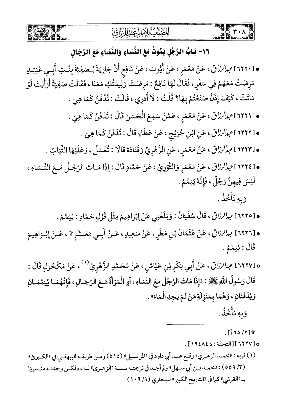 6227- عبد الرزاق، عَنْ أَبِي بَكْرِ بْنِ عَيَّاشٍ، عَن مُحَمَّدٍ الزُّهْرِيِّ، عَنْ مَكْحُولٍ قَالَ: قَالَ رَسُولُ اللهِ صَلَّى اللهُ عَلَيْهِ وَسَلَّمَ: إِذَا مَاتَ الرَّجُلُ مَعَ النِّسَاءِ، أَوِ المَرْأَةُ مَعَ الرِّجَالِ، فَإِنَّهُمَا يُيَمَّمَانِ وَيُدْفَنَانِ، وَهُمَا بِمَنْزِلَةِ مَنْ لَمْ يَجِدِ المَاءَ، وَبِهِ نَأْخُذُ.