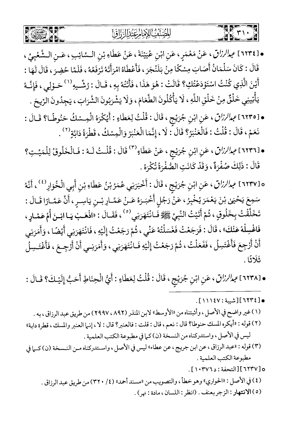 6235- عبد الرزاق، عَنِ ابْنِ جُرَيْجٍ، قَالَ: قُلْتُ لِعَطَاءٍ: أَيُكْرَهُ المِسْكُ حَنُوطًا؟ قَالَ: نَعَمْ، قَالَ: قُلْتُ: فَالْعَنْبَرُ؟ قَالَ: لاَ، إِنَّمَا الْعَنْبَرُ وَالمِسْكُ قَطْرَةُ دَابَّةٍ.
