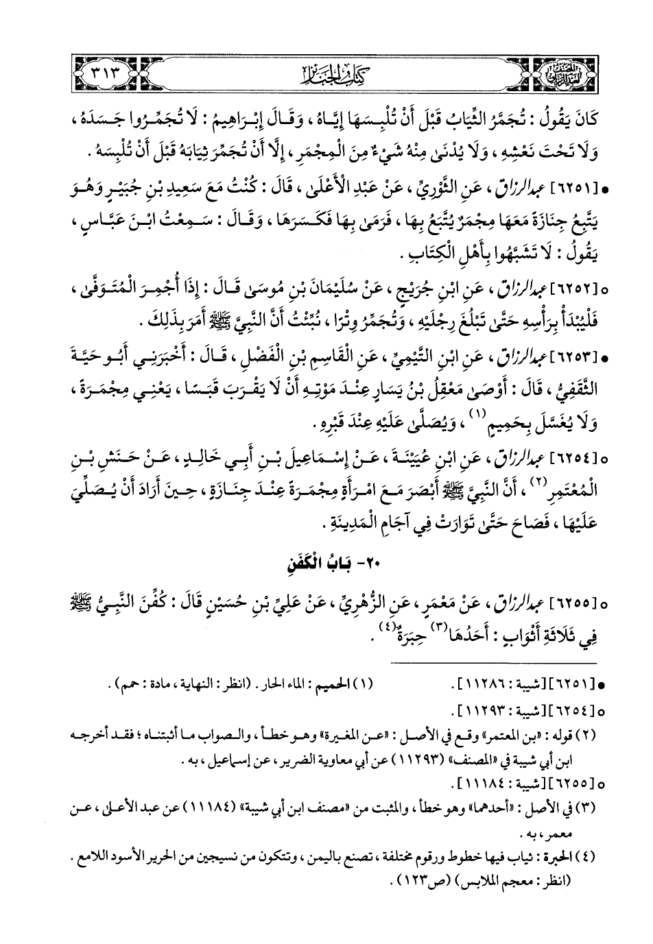 6255- عبد الرزاق، عَنْ مَعْمَرٍ، عَنِ الزُّهْرِيِّ، عَنْ عَلِيِّ بْنِ حُسَيْنٍ قَالَ: كُفِّنَ النَّبِيُّ صَلَّى اللهُ عَلَيْهِ وَسَلَّمَ فِي ثَلاَثَةِ أَثْوَابٍ: أَحَدُهَا حِبَرَةٌ.