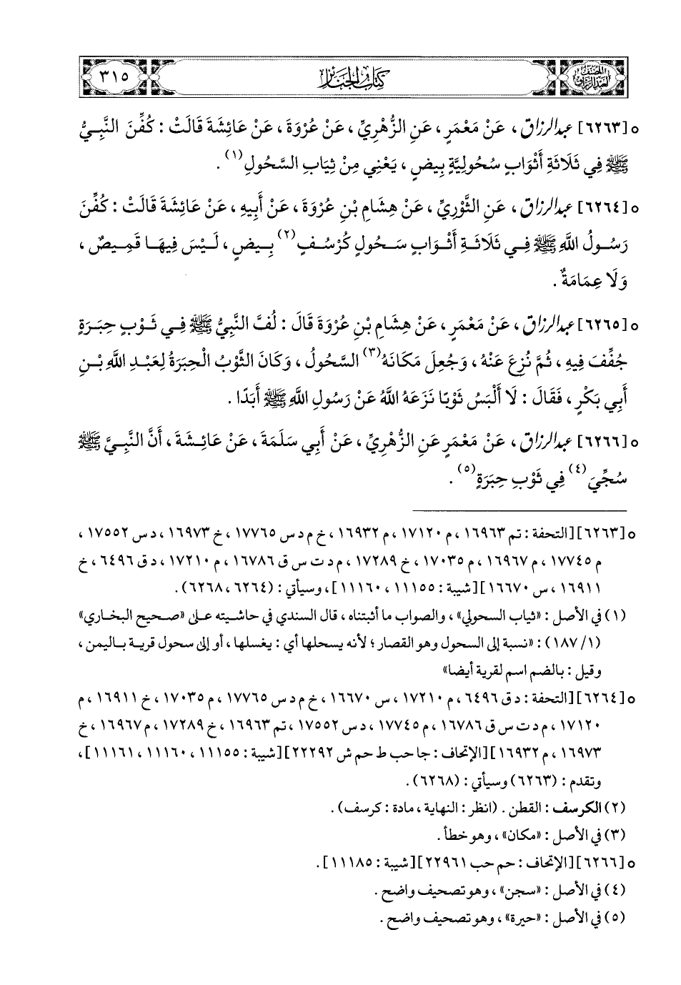 6263- عبد الرزاق، عَنْ مَعْمَرٍ، عَنِ الزُّهْرِيِّ، عَن عُرْوَةَ، عَنْ عَائِشَةَ، قَالَتْ: كُفِّنَ النَّبِيُّ صَلَّى اللهُ عَلَيْهِ وَسَلَّمَ فِي ثَلاَثَةِ أَثْوَابٍ سَحُولِيَّةٍ بِيضٍ، يَعْنِي مِنْ ثِيَابِ السَّحُولِ.