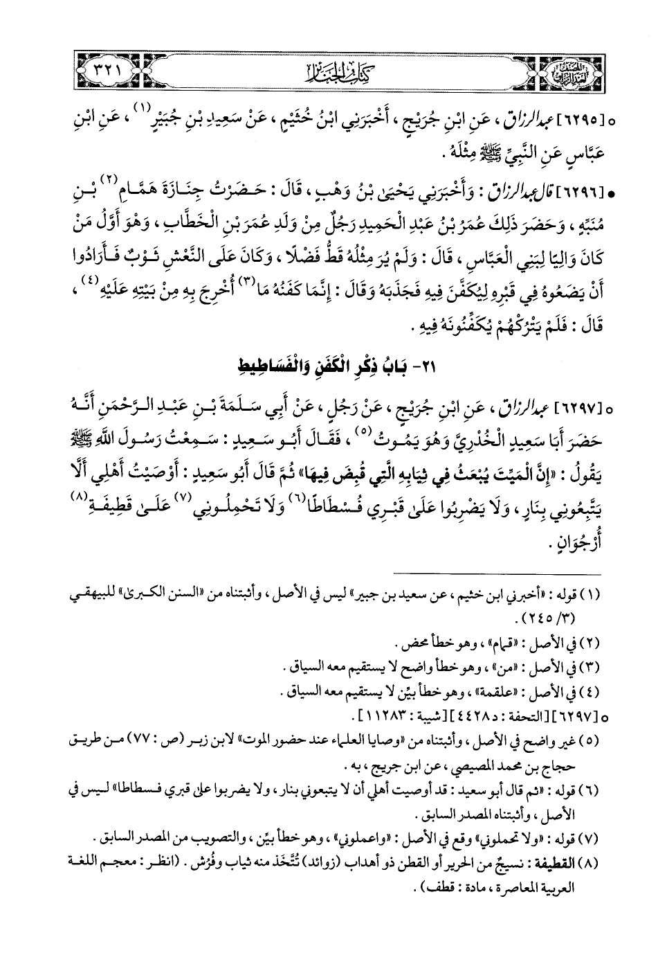 6296- قال عبد الرزاق، وَأَخْبَرَنِي يَحيَى بن وَهْبٍ قَالَ: حَضَرْتُ جِنَازَةَ هَمَّامِ بْنِ مُنَبِّهٍ، وَحَضَرَ ذَلِكَ عُمَرُ بن عَبدِ الْحَمِيدِ، رَجُلٌ مِنْ وَلَدِ عُمَرَ بْنِ الْخطَّابِ، وَهُوَ أَوَّلُ مَنْ كَانَ وَالِيًا لِبَنِي الْعَبَّاسِ، قَالَ: وَلَمْ يُرَ مِثْلُهُ قَطُّ فَضْلًا (1)، وَكَانَ عَلَى النَّعْشِ ثَوْبٌ، فَأَرَادُوا أَنْ يَضَعُوهُ فِي قَبْرِهِ لِيُكَفَّنَ فِيهِ فَجَذَبَهُ، وَقَالَ: إِنَّمَا كَفَنُهُ مَا أُخْرِجَ بِهِ مِنْ بَيْتِهِ عَلَيْهِ، قَالَ: فَلَمْ يَتْرُكْهُمْ يُكَفِّنُونَهُ فِيهِ.