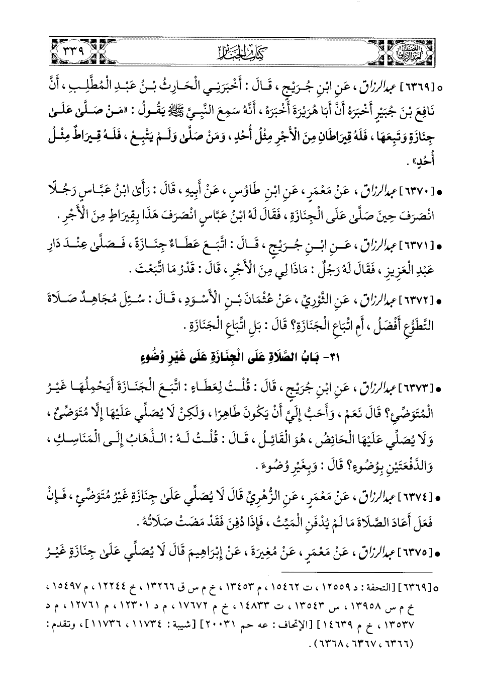 6373- عبد الرزاق، عَنِ ابْنِ جُرَيْجٍ، قَالَ: قُلْتُ لِعَطَاءٍ: اتَّبَعَ الْجِنَازَةَ أَيَحْمِلُهَا غَيْرُ المُتَوَضِّئِ؟ قَالَ: نَعَمْ، وَأَحَبُّ إِلَيَّ أَنْ يَكُونَ طَاهِرَا، وَلَكِنْ لاَ يُصَلِّي عَلَيْهَا إِلاَّ مُتَوَضِّئٌ، وَلاَ يُصَلِّي عَلَيْهَا الْحَائِضُ، هُوَ الْقَائِلُ، قَالَ: قُلْتُ لَهُ: الذِّهَابُ إِلَى المَنَاسِكِ وَالدَّفْعَتَيْنِ بِوُضُوءٍ؟ قَالَ: وَبِغَيْرِ وُضُوءٍ.