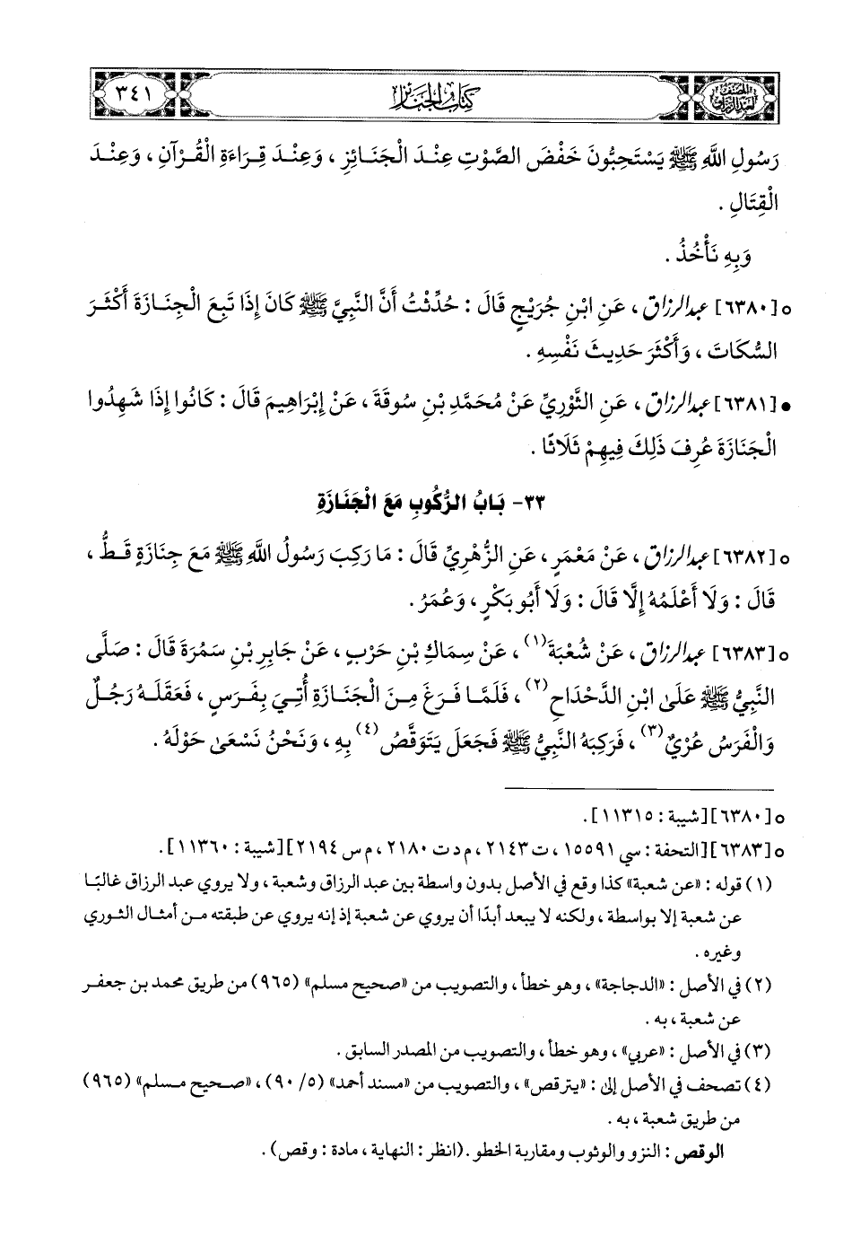 6383- عبد الرزاق، عَن شُعْبَةَ، عَن سِمَاكِ بْنِ حَرْبٍ، عَن جَابِرِ بْنِ سَمُرَةَ قَالَ: صَلَّى النبي صَلَّى اللهُ عَلَيْهِ وَسَلَّمَ عَلَى ابْنِ الدَّحْدَاحِ، فَلَمَّا فَرَغَ مِنَ الْجِنَازَةِ أُتِيَ بفَرَسٍ فَعَقَلَهُ رَجُلٌ وَالْفَرَسُ عُرْيٌ، فَرَكِبَهُ النَّبِيُّ صَلَّى اللهُ عَلَيْهِ وَسَلَّمَ، فَجَعَلَ يَتَوَقَّصُ بِهِ، وَنَحْنُ نَسْعَى حَوْلَهُ.