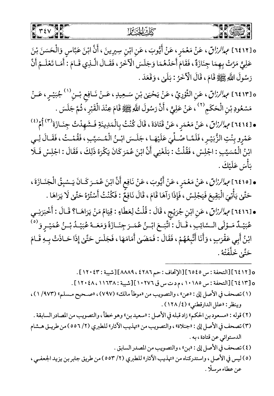 6415- عبد الرزاق، عَنْ مَعْمَرٍ، عَنْ أَيُّوبَ، عَن نَافِعٍ، أَنَّ ابْنَ عُمَرَ كَانَ يَسْبِقُ الْجِنَازَةَ، حَتَّى يأتِيَ الْبَقِيعَ فَيَجْلِسَ، فَإِذَا رَآهَا قَامَ، قَالَ نَافِعٌ: فَكُنْتُ أَسْتُرُهُ حَتَّى لاَ يَرَاهَا.