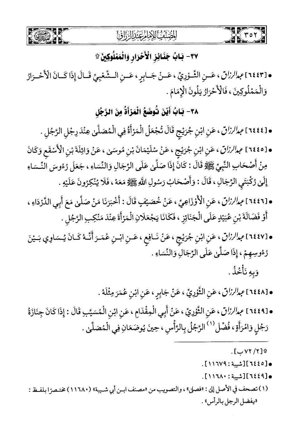 6445- عبد الرزاق، عَنِ ابْنِ جُرَيْجٍ، عَن سُلَيْمَانَ بْنِ مُوسَى، عَن وَاثِلَةَ بْنِ الأَسْقَعِ، وَكَانَ مِنْ أَصْحَابِ النَّبِيِّ صَلَّى اللهُ عَلَيْهِ وَسَلَّمَ قَالَ: كَانَ إِذَا صَلَّى عَلَى الرِّجَالِ وَالنِّسَاءِ، جَعَلَ رُؤُوسَ النِّسَاءِ إِلَى رُكْبَتَيِ الرِّجَالِ، قَالَ: وَأَصْحَابُ رَسُولِ اللهِ صَلَّى اللهُ عَلَيْهِ وَسَلَّمَ مَعَهُ، فَلاَ يُنْكِرُونَ عَلَيْهِ.