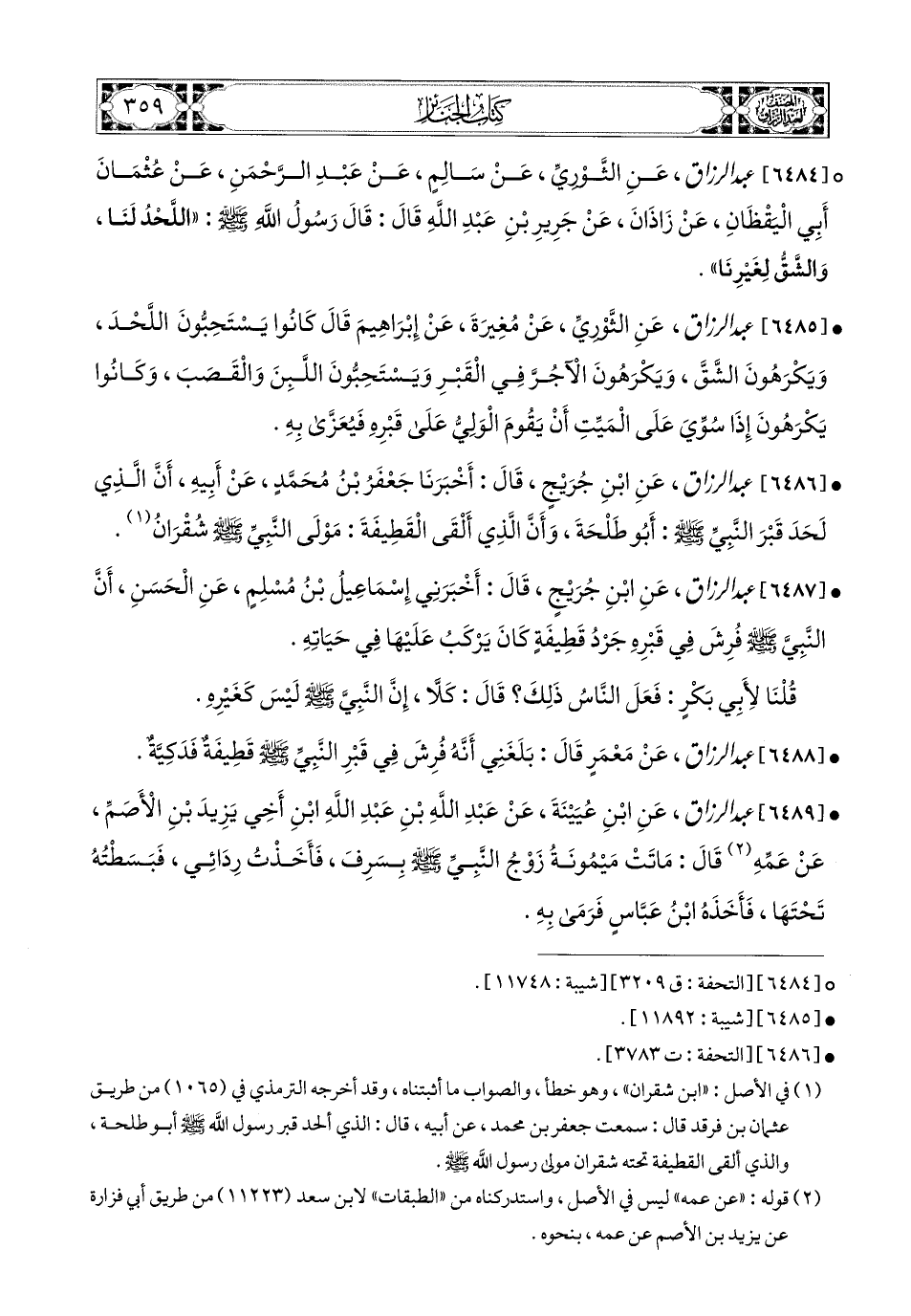 6486- عبد الرزاق، عَنِ ابْنِ جُرَيْجٍ، قَالَ: أَخْبَرَنَا جَعْفَرُ بن مُحَمَّدٍ، عَنْ أَبِيهِ، أَنَّ الَّذِي لَحَدَ قَبْرَ النَّبِيِّ صَلَّى اللهُ عَلَيْهِ وَسَلَّمَ: أَبو طَلْحَةَ، وَأَنَّ الَّذِي أَلْقَى الْقَطِيفَةَ، مَوْلَى النَّبِيِّ صَلَّى اللهُ عَلَيْهِ وَسَلَّمَ شُقْرَانُ.