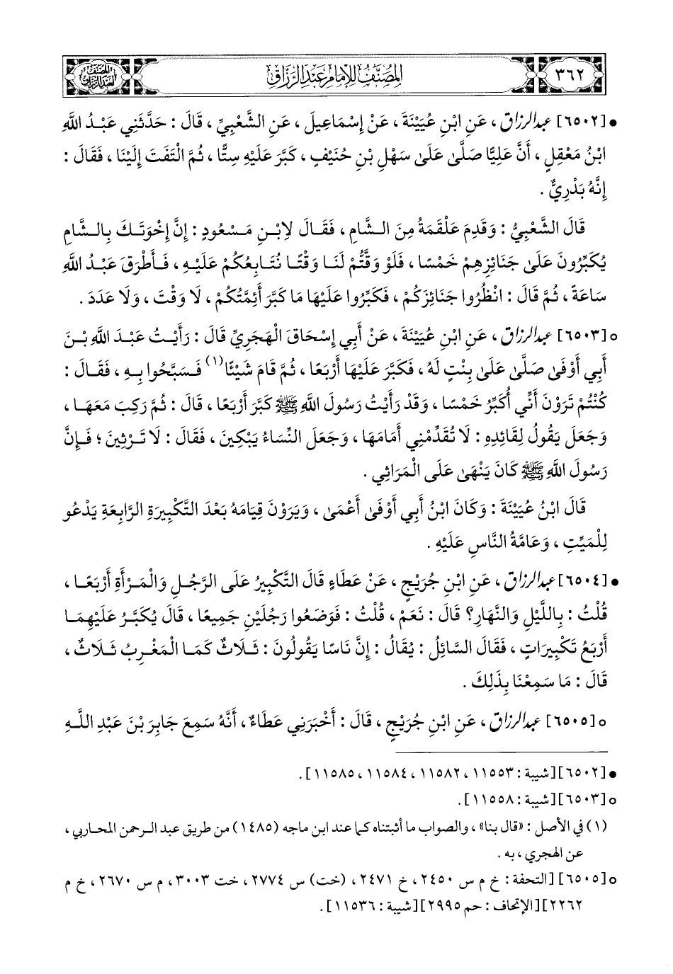 6502- عبد الرزاق، عَنِ ابْنِ عُيَيْنَةَ، عَن إِسْمَاعِيلَ، عَنِ الشَّعْبِيِّ، قَالَ: حَدَّثَنِي عَبدُ اللهِ بن مَعْقِلٍ، أَنَّ عَلِيًّا صَلَّى عَلَى سَهْلِ بْنِ حُنَيْفٍ، كَبَّرَ عَلَيْهِ سِتًّا، ثُمَّ الْتَفَتَ إِلَيْنَا، فَقَالَ: إِنَّهُ بَدْرِيٌّ.