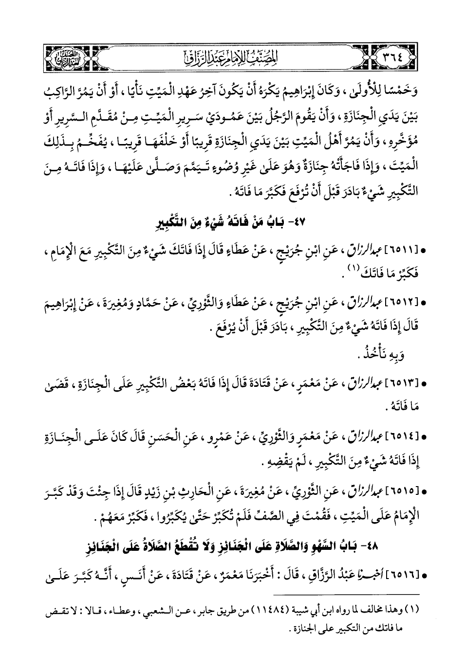 6513- عبد الرزاق، عَنْ مَعْمَرٍ، عَن قَتَادَةَ، قَالَ: إِذَا فَاتَهُ بَعْضُ التَّكْبِيرِ عَلَى الْجِنَازَةِ قَضَى مَا فَاتَهُ.