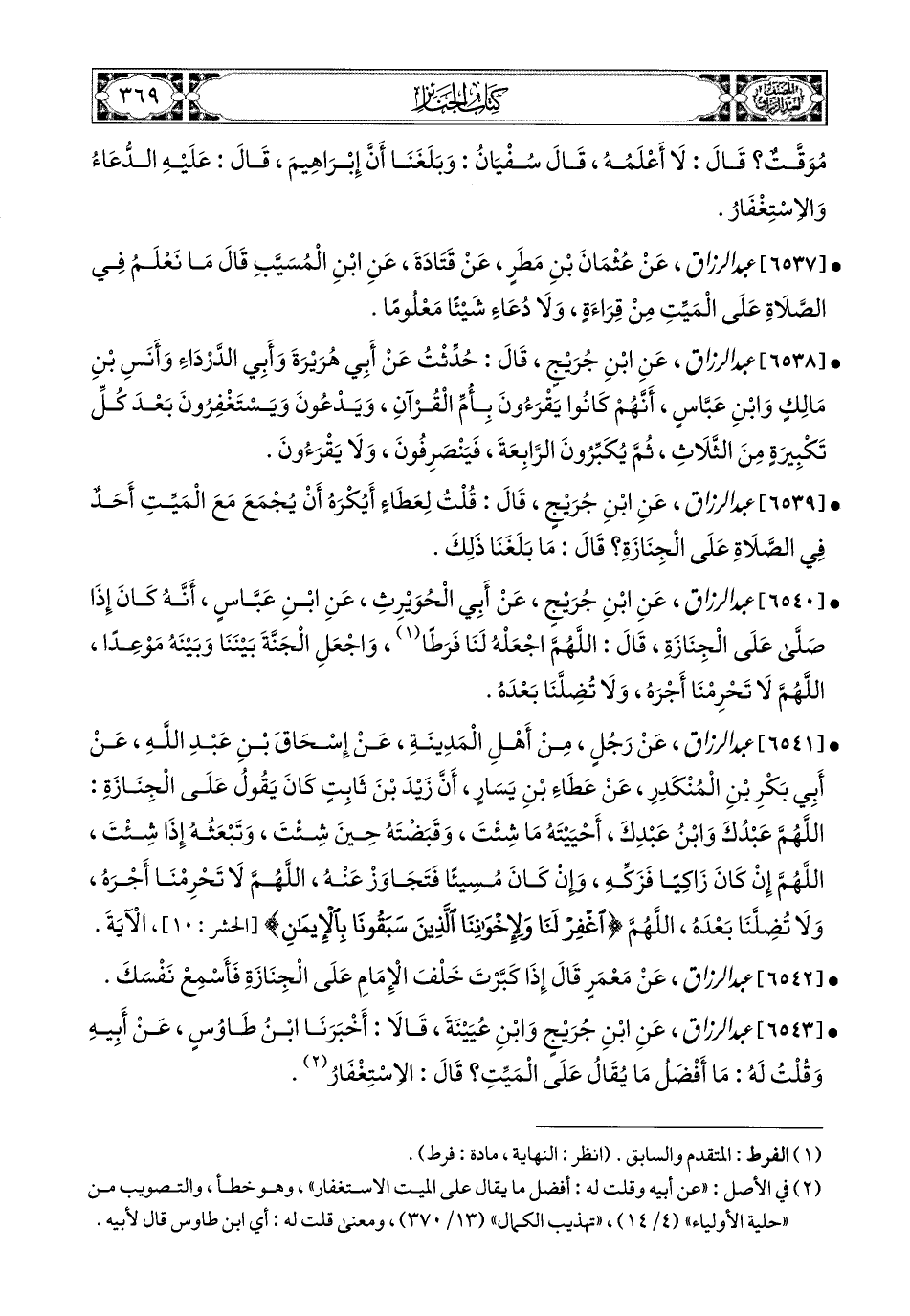 6541- عبد الرزاق، عَن رَجُلٍ مِنْ أَهْلِ المَدِينَةِ، عَن إِسْحَاقَ بْنِ عَبدِ اللهِ، عَنْ أَبِي بَكْرِ بْنِ المُنْكَدِرِ، عَنْ عَطَاءِ بْنِ يَسَارٍ، أَنَّ زَيْدَ بن ثَابِتٍ كَانَ يَقُولُ عَلَى الْجِنَازَةِ: اللهُمَّ عَبدُكَ وَابْنُ عَبدِكَ، أَحْيَيْتَهُ مَا شِئْتَ، وَقَبَضْتَهُ حِينَ شِئْتَ، وَتَبْعَثُهُ إِذَا شِئْتَ، اللهُمَّ إِنْ كَانَ زَاكِيًا فَزَكِّهِ، وَإِنْ كَانَ مُسِيئًا فَتَجَاوَزْ عَنْهُ، اللهُمَّ لاَ تَحْرِمْنَا أَجْرَهُ، وَلاَ تُضِلَّنَا بَعْدَهُ، اللهُمَّ {اغْفِرْ لَنَا وَلإِخْوَانِنَا الَّذِينَ سَبَقُونَا بِالإِيمَانِ} الآيَةُ.