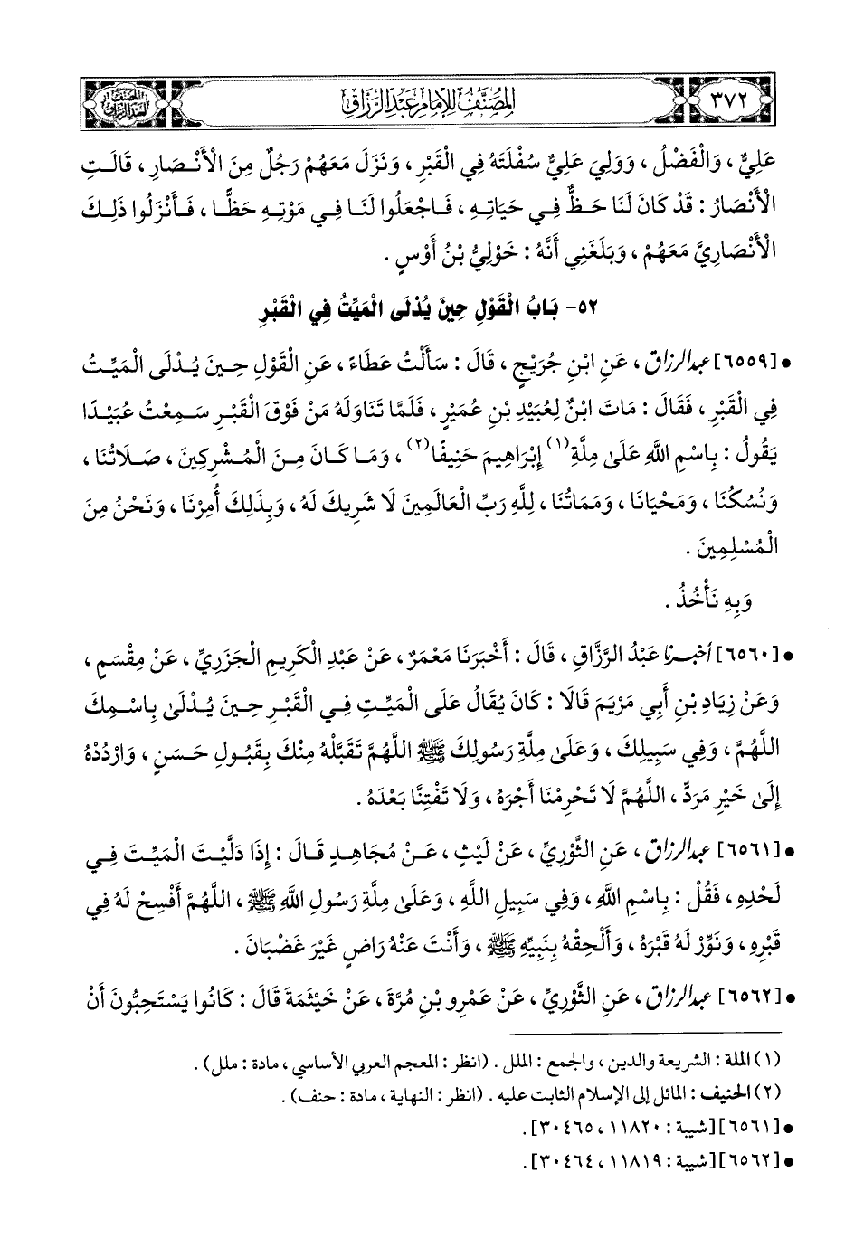 6560- أخبرنا عبد الرزاق، قَالَ: أَخْبَرَنَا مَعْمَرٌ، عَنْ عَبدِ الْكَرِيمِ الْجَزَرِيِّ، عَن مِقْسَمٍ، وَعَنْ زِيَادِ بْنِ أَبِي مَرْيَمَ، قَالاَ: كَانَ يُقَالُ عَلَى المَيِّتِ فِي الْقَبْرِ حِينَ يُدْلَى: بِاسْمِكَ اللهُمَّ، وَفِي سَبِيلِكَ، وَعَلَى مِلَّةِ رَسُولِكَ صَلَّى اللهُ عَلَيْهِ وَسَلَّمَ، اللهُمَّ تَقَبَّلَهُ مِنْكَ بِقَبُولٍ حَسَنٍ، واردده إِلَى خَيْرِ مَرَدٍّ، اللهُمَّ لاَ تَحْرِمْنَا أَجْرَهُ، وَلاَ تَفْتِنَّا بَعْدَهُ.