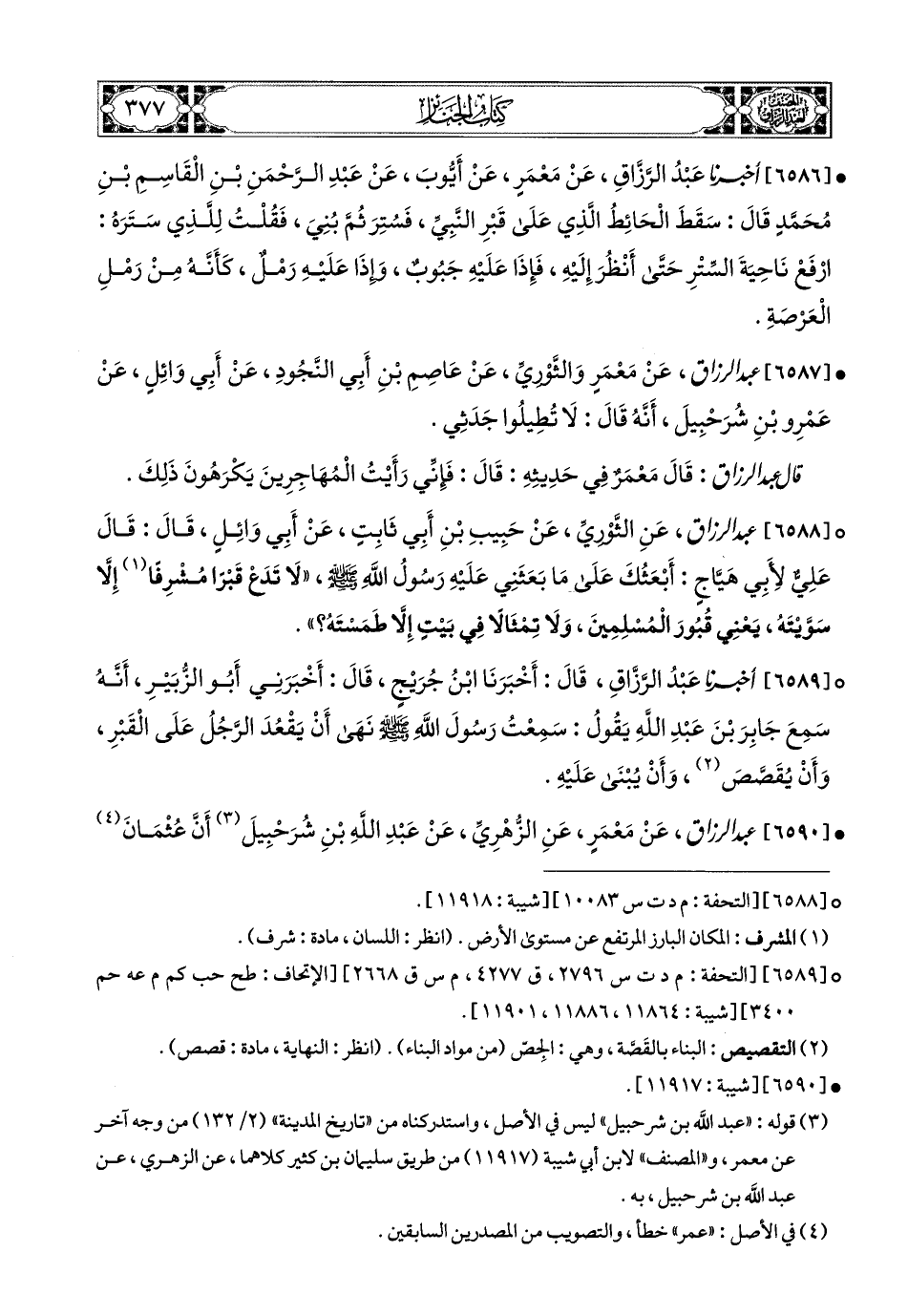 6589- أخبرنا عبد الرزاق، قَالَ: أَخْبَرَنَا ابْنُ جُرَيْجٍ، قَالَ: أَخْبَرَنِي أَبو الزُّبَيْرِ، أَنَّهُ سَمِعَ جَابِرَ بن عَبدِ اللهِ يَقُولُ: سَمِعْتُ رَسُولَ اللهِ صَلَّى اللهُ عَلَيْهِ وَسَلَّمَ نَهَى أَنْ يَقْعُدَ الرَّجُلُ عَلَى الْقَبْرِ، وَأَنْ يُقَصَّصَ، وَأَنْ يُبْنَى عَلَيْهِ.