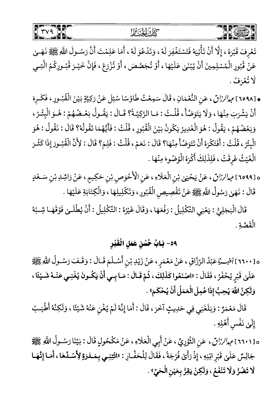 6600- أخبرنا عبد الرزاق، عَنْ مَعْمَرٍ، عَن زَيْدِ بْنِ أَسْلَمَ قَالَ: وَقَفَ رَسُولُ اللهِ صَلَّى اللهُ عَلَيْهِ وَسَلَّمَ عَلَى قَبْرٍ يُحْفَرُ، فَقَالَ: اصْنَعُوا كَذَلِكَ، ثُمَّ قَالَ: مَا بِي أَنْ يَكُونَ يُغْنِي عَنْهُ شَيْئًا، وَلَكِنَّ اللهَ يُحِبُّ إِذَا عُمِلَ الْعَمَلُ أَنْ يحْكم.