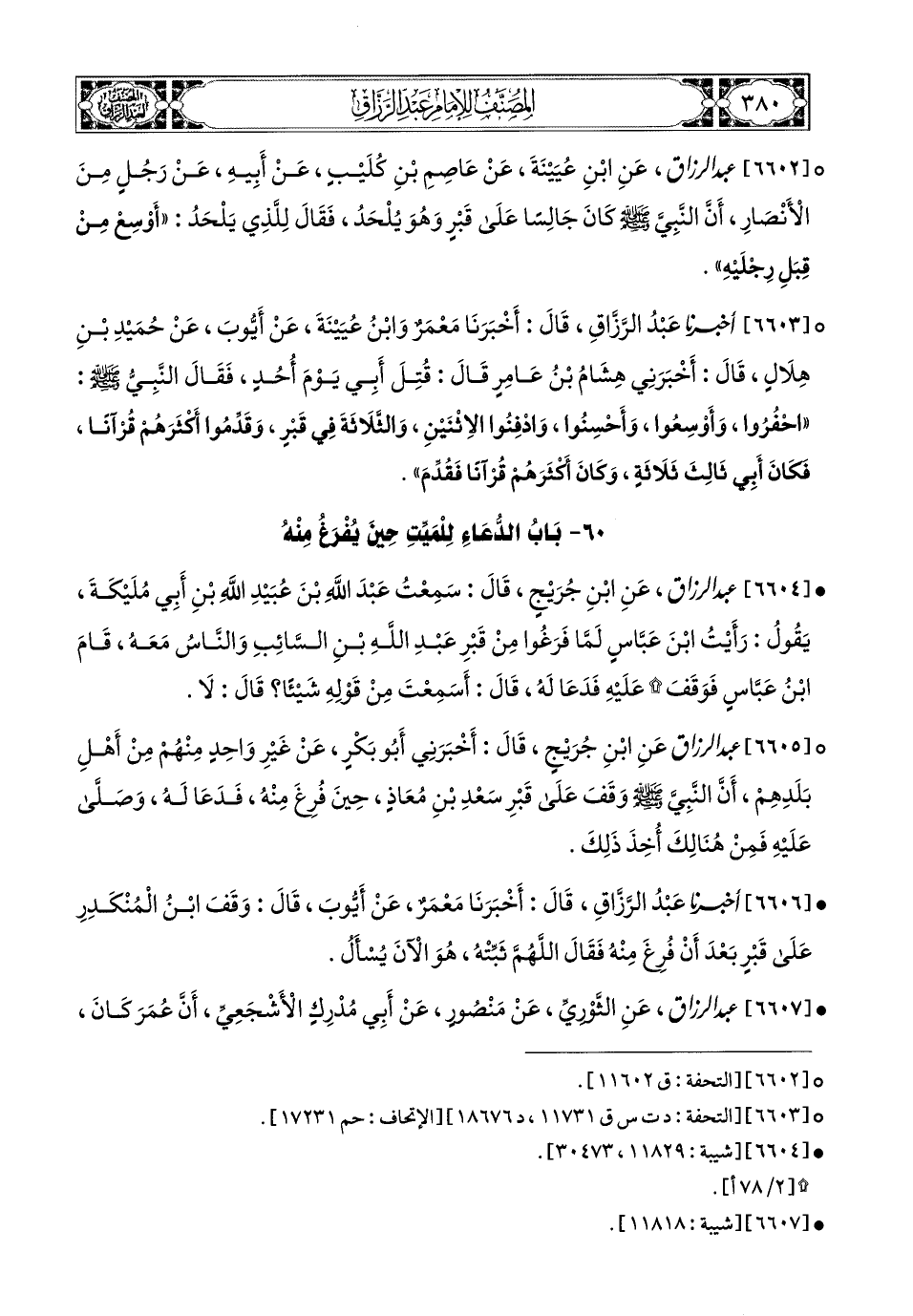 6605- عبد الرزاق، عَنِ ابْنِ جُرَيْجٍ، قَالَ: أَخْبَرَنِي أَبو بَكْرٍ، عَن غَيْرِ وَاحِدٍ مِنْهُمْ مِنْ أَهْلِ بَلَدِهِمْ، أَنَّ النَّبِيَّ صَلَّى اللهُ عَلَيْهِ وَسَلَّمَ وَقَفَ عَلَى قَبْرِ سَعْدِ بْنِ مُعَاذٍ حِينَ فَرَغَ مِنْهُ، فَدَعَا لَهُ وَصَلَّى عَلَيْهِ، فَمِنْ هُنَالِكَ أُخِذَ ذَلِكَ.