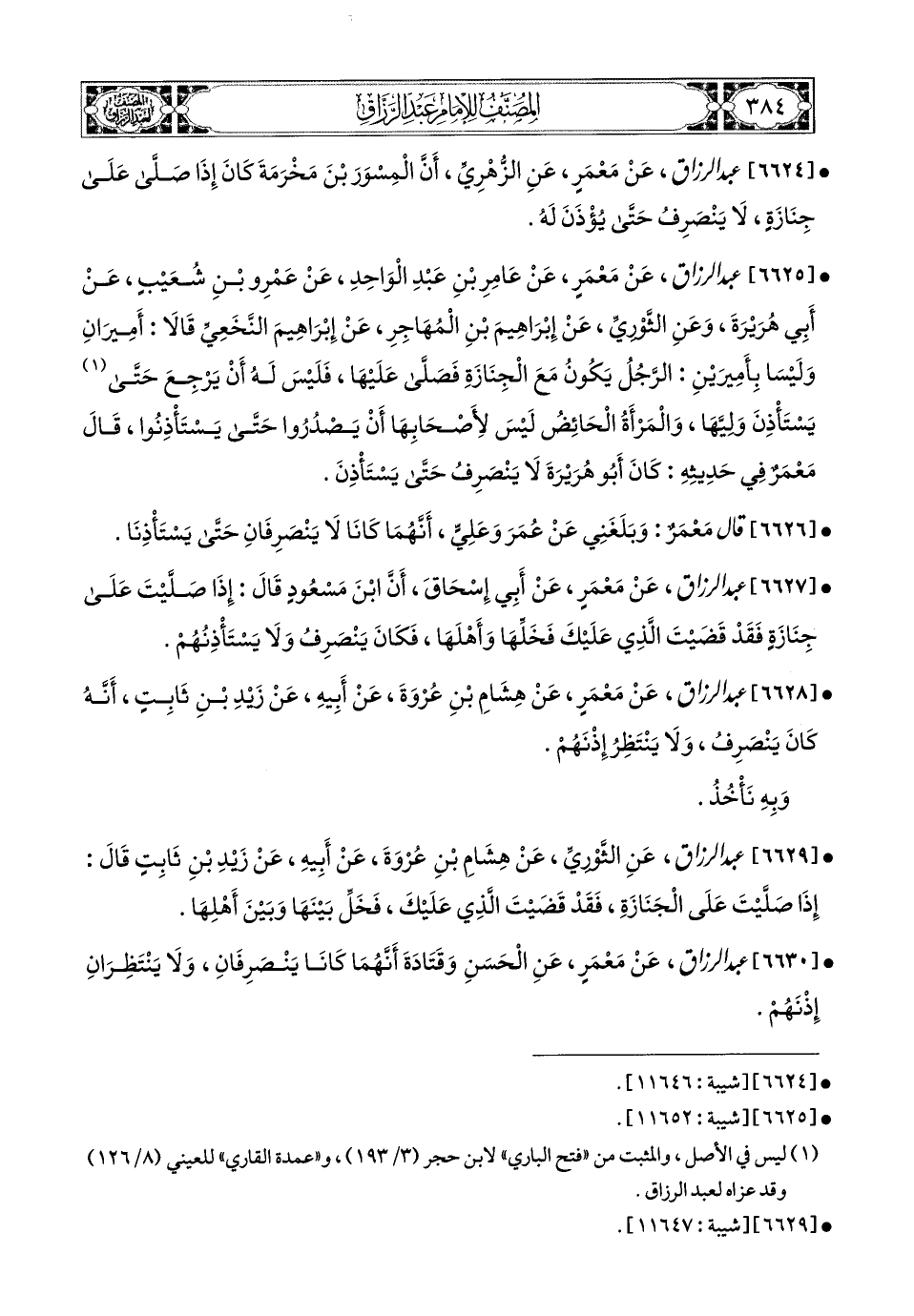6625- عبد الرزاق، عَنْ مَعْمَرٍ، عَنْ عَامِرِ بْنِ عَبدِ الْوَاحِدِ، عَنْ عَمْرِو بنِ شُعَيْبٍ، عَنْ أَبِي هُرَيرَةَ، وَعَنِ الثَّورِيِّ، عَن إِبرَاهِيمَ بْنِ المُهَاجِرِ، عَن إِبرَاهِيمَ النَّخَعِيِّ، قَالاَ: أَمِيرَانِ وَلَيْسَا بِأَمِيرَيْنِ: الرَّجُلُ يَكُونُ مَعَ الْجِنَازَةِ فَصَلَّى عَلَيْهَا فَلَيْسَ لَهُ أَنْ يَرْجِعَ حَتَّى يَسْتَأْذِنَ وَلِيَّهَا، وَالمَرْأَةُ الْحَائِضُ لَيْسَ لأَصْحَابِهَا أَنْ يَصْدُرُوا حَتَّى يَسْتَأْذِنُوا.