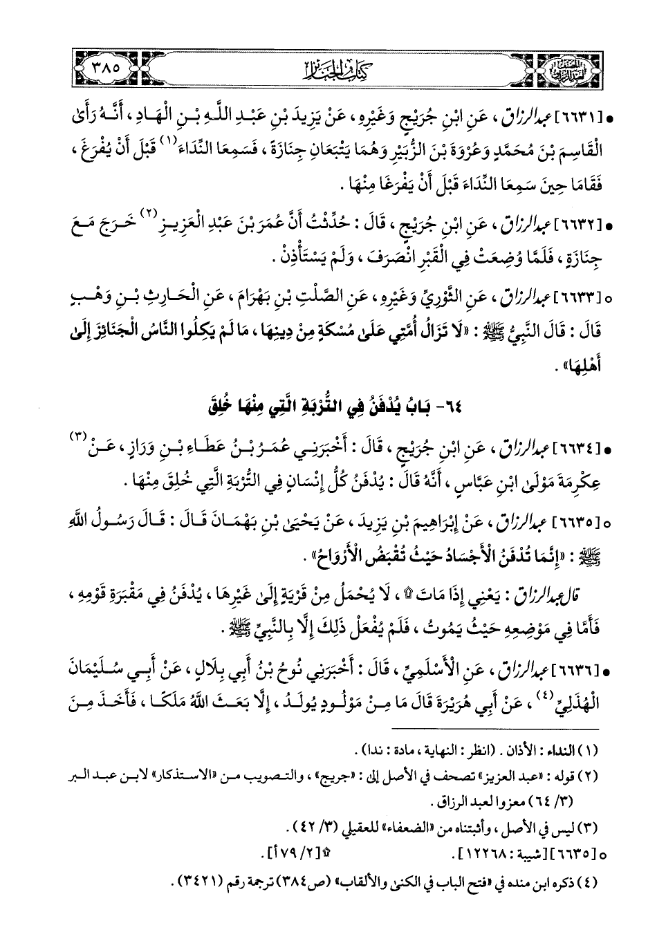 قَالَ عَبدُ الرَّزَّاقِ: يَعْنِي إِذَا مَاتَ لاَ يُحْمَلُ مِنْ قَرْيَةٍ إِلَى غيرها، يُدْفَنُ فِي مَقْبَرَةِ قَوْمِهِ، فَأَمَّا فِي مَوْضِعِهِ حَيْثُ يَمُوتُ فَلَمْ يُفْعَلْ ذَلِكَ إِلاَّ بِالنَّبِيِّ صَلَّى اللهُ عَلَيْهِ وَسَلَّمَ.