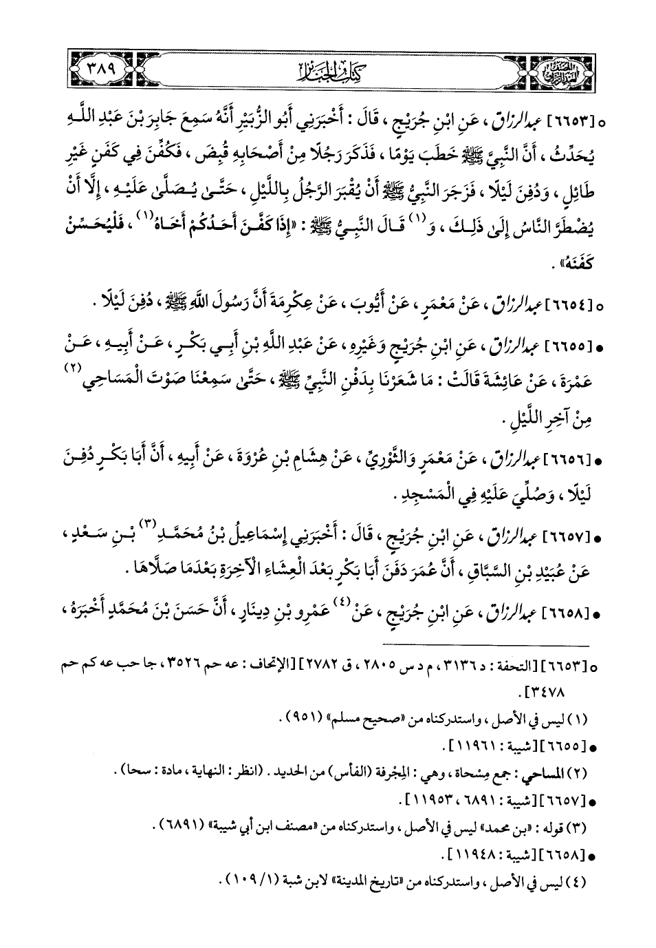 6653- عبد الرزاق، عَنِ ابْنِ جُرَيْجٍ، قَالَ: أَخْبَرَنِي أَبو الزُّبَيْرِ، أَنَّهُ سَمِعَ جَابِرَ بن عَبدِ اللهِ يُحَدِّثُ، أَنَّ النَّبِيَّ صَلَّى اللهُ عَلَيْهِ وَسَلَّمَ خَطَبَ يَوْمًا، فَذَكَرَ رَجُلاً مِنْ أَصْحَابِهِ قُبِضَ، فَكُفِّنَ فِي كَفَنٍ غَيْرِ طَائِلٍ، وَدُفِنَ لَيْلاً، فَزَجَرَ النَّبِيُّ صَلَّى اللهُ عَلَيْهِ وَسَلَّمَ أَنْ يُقْبَرَ الرَّجُلُ بِاللَّيْلِ، حَتَّى يُصَلَّى عَلَيْهِ، إِلاَّ أَنْ يُضْطَرَّ النَّاسُ إِلَى ذَلِكَ، وَقَالَ النَّبِيُّ صَلَّى اللهُ عَلَيْهِ وَسَلَّمَ: إِذَا كَفَّنَ أَحَدُكُمْ أَخَاهُ، فَلْيُحْسِنْ كَفَنَهُ.