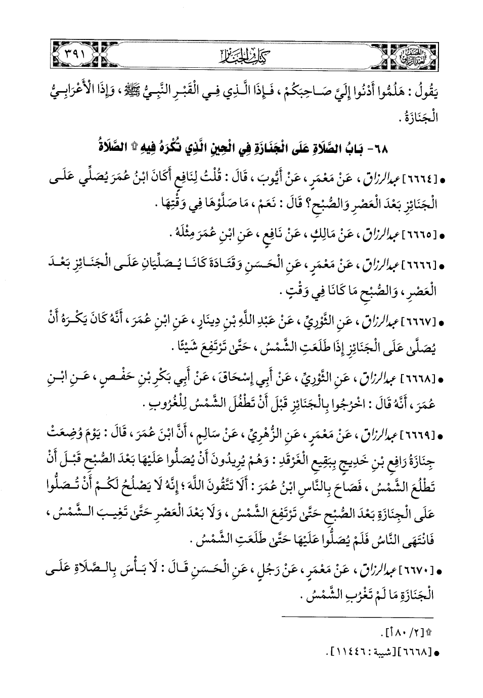 6669- عبد الرزاق، عَنْ مَعْمَرٍ، عَنِ الزُّهْرِيِّ، عَن سَالِمٍ، أَنَّ ابْنَ عُمَرَ قَالَ يَوْمَ وُضِعَتْ جِنَازَةُ رَافِعِ بْنِ خَدِيجٍ بِبَقِيعِ الْغَرْقَدِ، وهم يُرِيدُونَ أَنْ يُصَلُّوا عَلَيْهَا بَعْدَ الصُّبْحِ، قَبْلَ أَنْ تَطْلُعَ الشَّمْسُ، فَصَاحَ بِالنَّاسِ ابْنُ عُمَرَ: أَلاَ تَتَّقُونَ اللهَ إِنَّهُ لاَ يَصْلُحُ لَكُمْ أَنْ تُصَلُّوا عَلَى الْجَنَازةِ بَعْدَ الصُّبْحِ، حَتَّى تَرْتَفِعَ الشَّمْسُ، وَلاَ بَعْدَ الْعَصْرِ، حَتَّى تَغِيبَ الشَّمْسُ، فَانْتَهَى النَّاسُ، فَلَمْ يُصَلُّوا عَلَيْهَا حَتَّى طَلَعَتِ الشَّمْسُ.