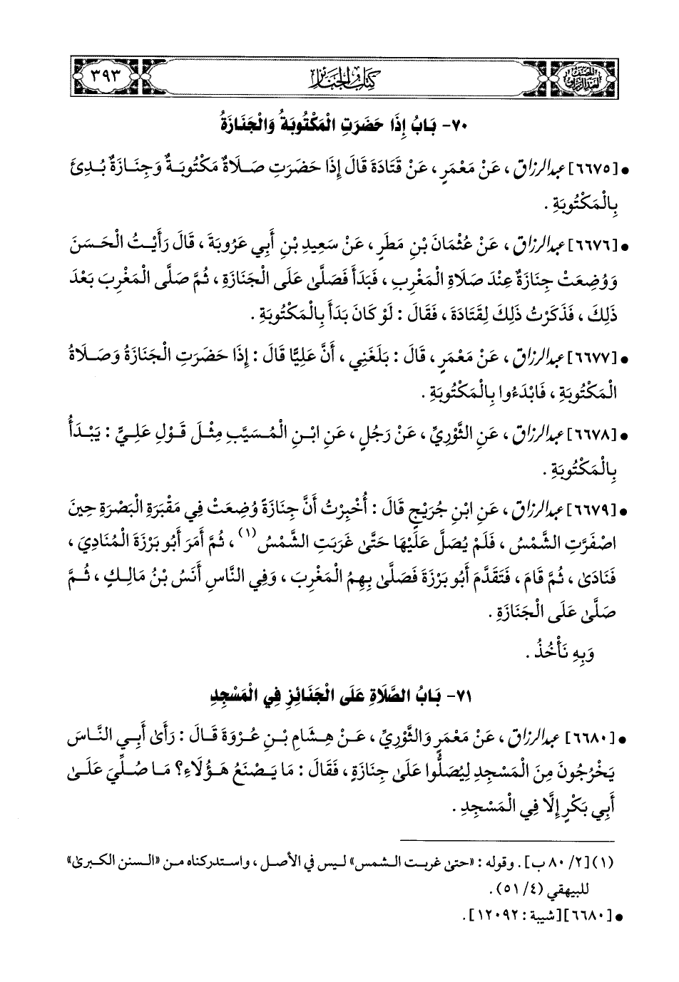 6676- عبد الرزاق، عَن عُثْمَانَ بْنِ مَطَرٍ، عَن سَعيدِ بْنِ أَبِي عَرُوبَةَ، قَالَ: رَأَيْتُ الْحَسَنَ وَوُضِعَتْ جِنَازَةٌ عِنْدَ صَلاَةِ المَغْرِبِ، فَبَدَأَ، فَصَلَّى عَلَى الْجِنَازَةِ، ثُمَّ صَلَّى المَغْرِبَ بَعْدَ ذَلِكَ، فَذَكَرْتُ ذَلِكَ لِقَتَادَةَ فَقَالَ: لَوْ كَانَ بَدَأَ بِالمَكْتُوبَةِ.