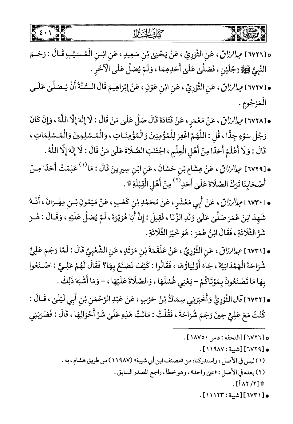 6727- عبد الرزاق، عَنِ الثَّورِيِّ، عَنِ ابْنِ عَوْنٍ، عَن إِبرَاهِيمَ، قَالَ: السُّنَّةُ أَنْ يُصَلَّى عَلَى المَرْجُومِ.