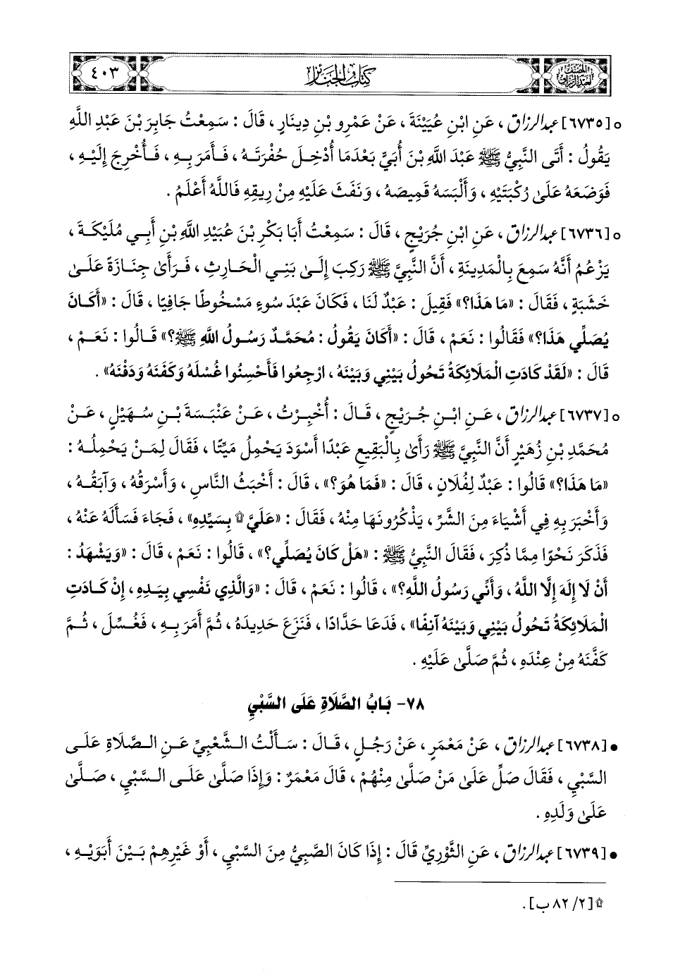 6737- عبد الرزاق، عَنِ ابْنِ جُرَيْجٍ، قَالَ: أُخْبِرْتُ عَنْ عَنْبَسَةَ بْنِ سُهَيْلٍ، عَن مُحَمَّدِ بْنِ زُهَيْرٍ، أَنَّ النَّبِيَّ صَلَّى اللهُ عَلَيْهِ وَسَلَّمَ رَأَى بِالْبَقِيعِ عَبدًا أَسْوَدَ يُحْمَلُ مَيِّتًا فَقَالَ لِمَنْ يَحْمِلُهُ: مَا هَذَا؟ قَالُوا: عَبدٌ لِفُلاَنٍ، قَالَ: فَمَا هُوَ؟ قَالُوا: أَخْبَثُ النَّاسِ وَأَسْرَقُهُ وَآبَقُهُ، وَأُخْبِرَ بِهِ (1) فِي أَشْيَاءَ مِنَ الشَّرِّ يَذْكُرُونَهَا مِنْهُ، فَقَالَ: عَلَيَّ بِسَيِّدِهِ، فجاء، فَسَأَلَهُ عَنْهُ، فَذَكَرَ نَحْوًا مِمَّا ذُكِرَ، فَقَالَ النَّبِيُّ صَلَّى اللهُ عَلَيْهِ وَسَلَّمَ: هَلْ كَانَ يُصَلِّي؟ قَالُوا: نَعَمْ، قَالَ: وَيَشْهَدُ أَنْ لاَ إِلَهَ إِلاَّ اللهُ، وَأَنِّي رَسُولُ اللهِ؟ قَالُوا: نَعَمْ، قَالَ: وَالَّذِي نَفْسِي بِيَدِهِ، إِنْ كَادَتِ المَلاَئِكَةُ تَحُولُ بَيْنِي وَبَيْنَهُ آنِفًا، فَدَعَا حَدَّادًا فَنَزَعَ حَدِيدَه، ثُمَّ أُمِرَ بِهِ فَغُسِّلَ، ثُمَّ كَفَّنَهُ مِنْ عِنْدِهِ ثُمَّ صَلَّى عَلَيْهِ.