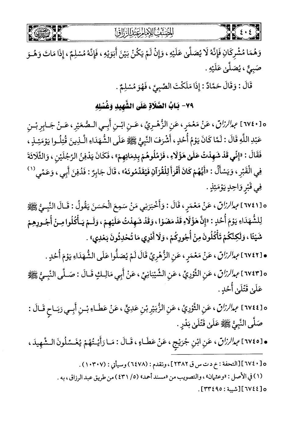 6740- عبد الرزاق، عَنْ مَعْمَرٍ، عَنِ الزُّهْرِيِّ، عَنِ ابْنِ أَبِي الصُّعَيْرِ، عَن جَابِرِ بْنِ عَبدِ اللهِ قَالَ: لَمَّا كَانَ يَوْمُ أُحُدٍ، أَشْرَفَ النَّبِيُّ صَلَّى اللهُ عَلَيْهِ وَسَلَّمَ عَلَى الشُّهَدَاءِ الَّذِينَ قُتِلُوا يَوْمَئِذٍ، فَقَالَ: إِنِّي قَدْ شَهِدْتُ عَلَى هَؤُلاَءِ، فَزَمِّلُوهُمْ بِدِمَائِهِمْ فَكَانَ يَدْفِنُ الرَّجُلَيْنِ وَالثَّلاَثَةَ فِي الْقَبْرِ، وَيَسْأَلُ أَيُّهُمْ كَانَ أَقْرَأَ لِلْقُرْآنِ فَيُقَدِّمُونَهُ.