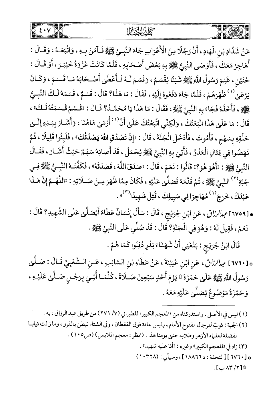 6760- عبد الرزاق، عَنِ ابْنِ عُيَيْنَةَ، عَنْ عَطَاءِ بْنِ السَّائِبِ، عَنِ الشَّعْبِيِّ، قَالَ: صَلَّى رَسُولُ اللهِ صَلَّى اللهُ عَلَيْهِ وَسَلَّمَ عَلَى حَمْزَةَ يَوْمَ أُحُدٍ سَبْعِينَ صَلاَةً، كُلَّمَا أُتِيَ بِرَجُلٍ صَلَّى عَلَيْهِ، وَحَمْزَةُ مَوْضُوعٌ، يُصَلَّى عَلَيْهِ مَعَهُ.