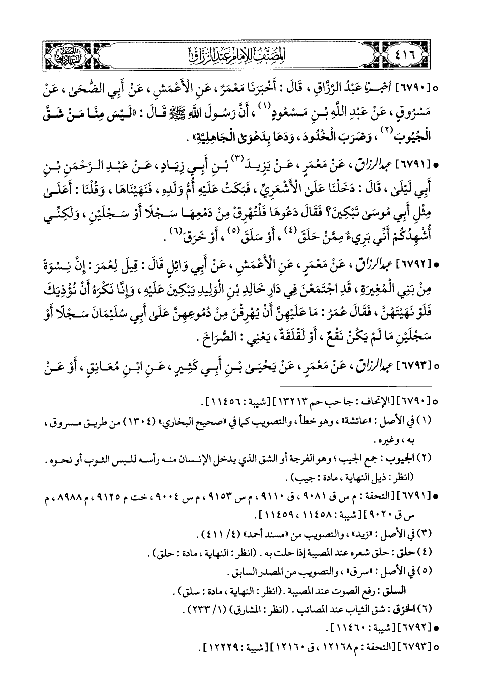 6790- أخبرنا عبد الرزاق، قَالَ: أَخْبَرَنَا مَعْمَرٌ، عَنِ الأَعمَشِ، عَنْ أَبِي الضُّحَى، عَنْ مَسْرُوقٍ، عَنْ عَبْدِ اللهِ بْنِ مَسْعُودٍ، أَنَّ رَسُولَ اللهِ صَلَّى اللهُ عَلَيْهِ وَسَلَّمَ قَالَ: لَيْسَ مِنَّا مَنْ شَقَّ الْجُيُوبَ، وَضَرَبَ الْخُدُودَ، وَدَعَا بِدَعْوَى الْجَاهِلِيَّةِ.