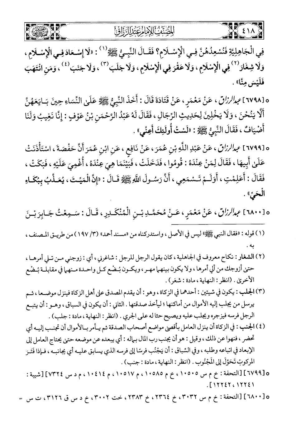 6798- عبد الرزاق، عَنْ مَعْمَرٍ، عَن قَتَادَةَ، قَالَ: أَخَذَ النَّبِيُّ صَلَّى اللهُ عَلَيْهِ وَسَلَّمَ عَلَى النِّسَاءِ حِينَ بَايَعَهُنَّ أَنْ لاَ يَنُحْنَ، وَلاَ يَخلينَ لِحَدِيثِ الرِّجَالِ، فَقَالَ لَهُ عَبدُ الرَّحْمَنِ بن عَوْفٍ: إِنَّا نَغِيبُ وَلَنَا أَضْيَافٌ، فَقَالَ النَّبِيُّ صَلَّى اللهُ عَلَيْهِ وَسَلَّمَ: لَسْتُ أُولَئِكَ أَعْنِي.
