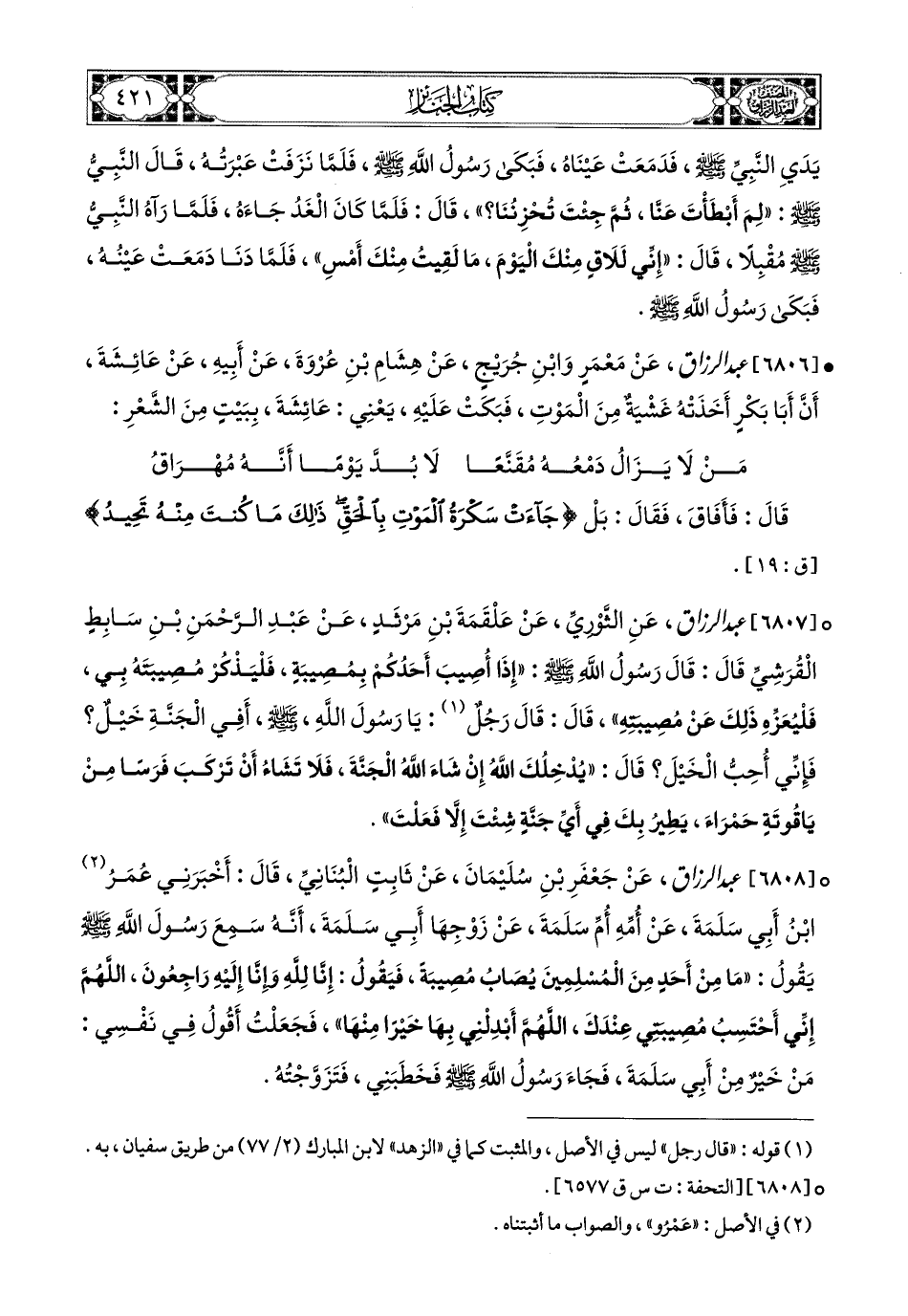 6807- عبد الرزاق، عَنِ الثَّورِيِّ، عَنْ عَلْقَمَةَ بْنِ مَرْثَدٍ، عَنْ عَبدِ الرَّحْمَنِ بْنِ سَابِطٍ الْقُرَشِيِّ، قَالَ: قَالَ رَسُولُ اللهِ صَلَّى اللهُ عَلَيْهِ وَسَلَّمَ: إِذَا أُصِيبَ أَحَدُكُمْ بِمُصِيبَةٍ، فَلْيَذْكُرْ مُصِيبَتَهُ بِي، فلِيُعَزِّهِ ذَلِكَ عَن مُصِيبَتِهِ.